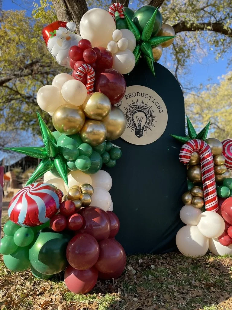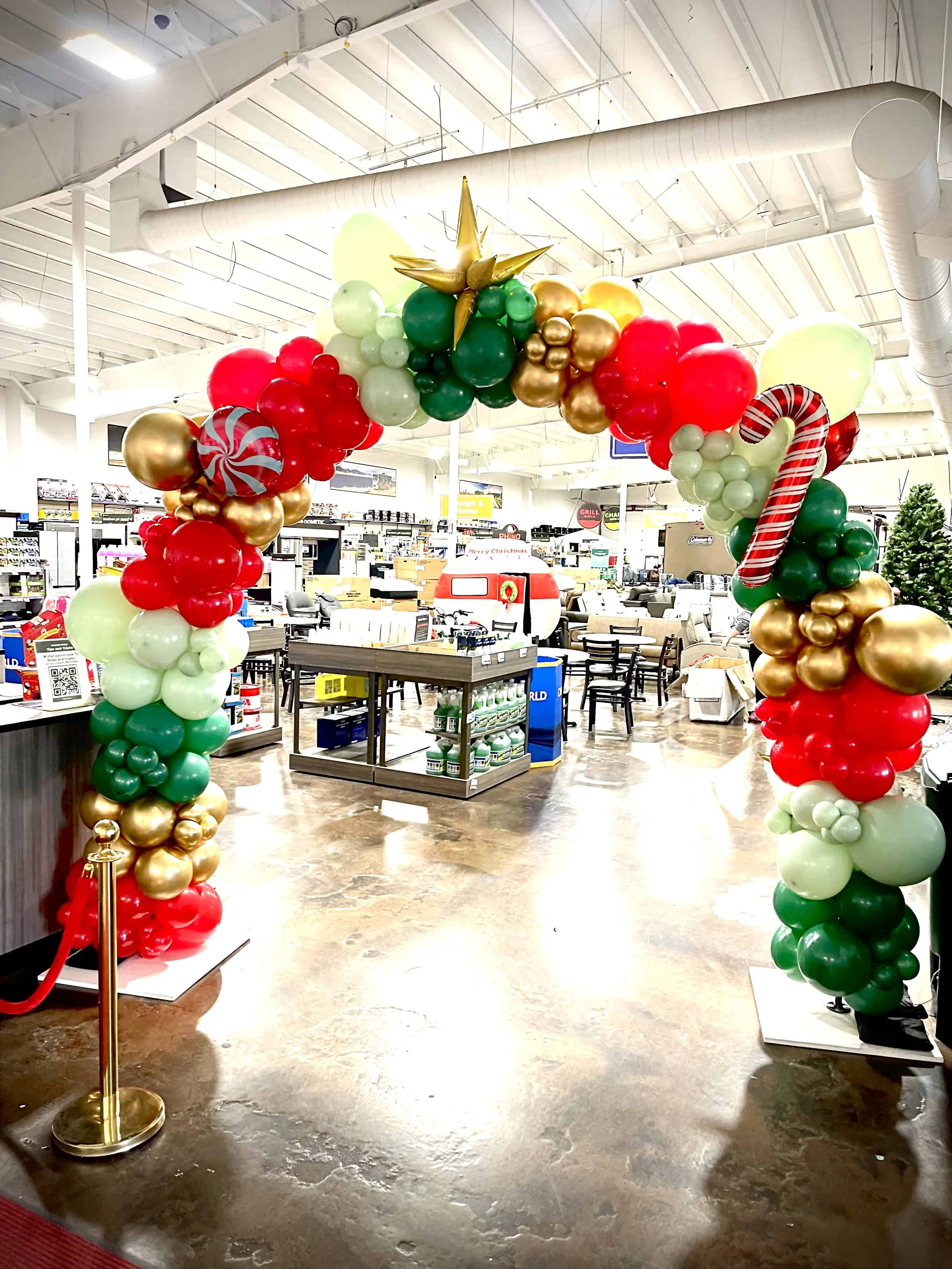 Festive balloon arch with Christmas decorations, including Santa Claus, candy canes, and ornaments in red, green, gold, and white. Located outdoors.