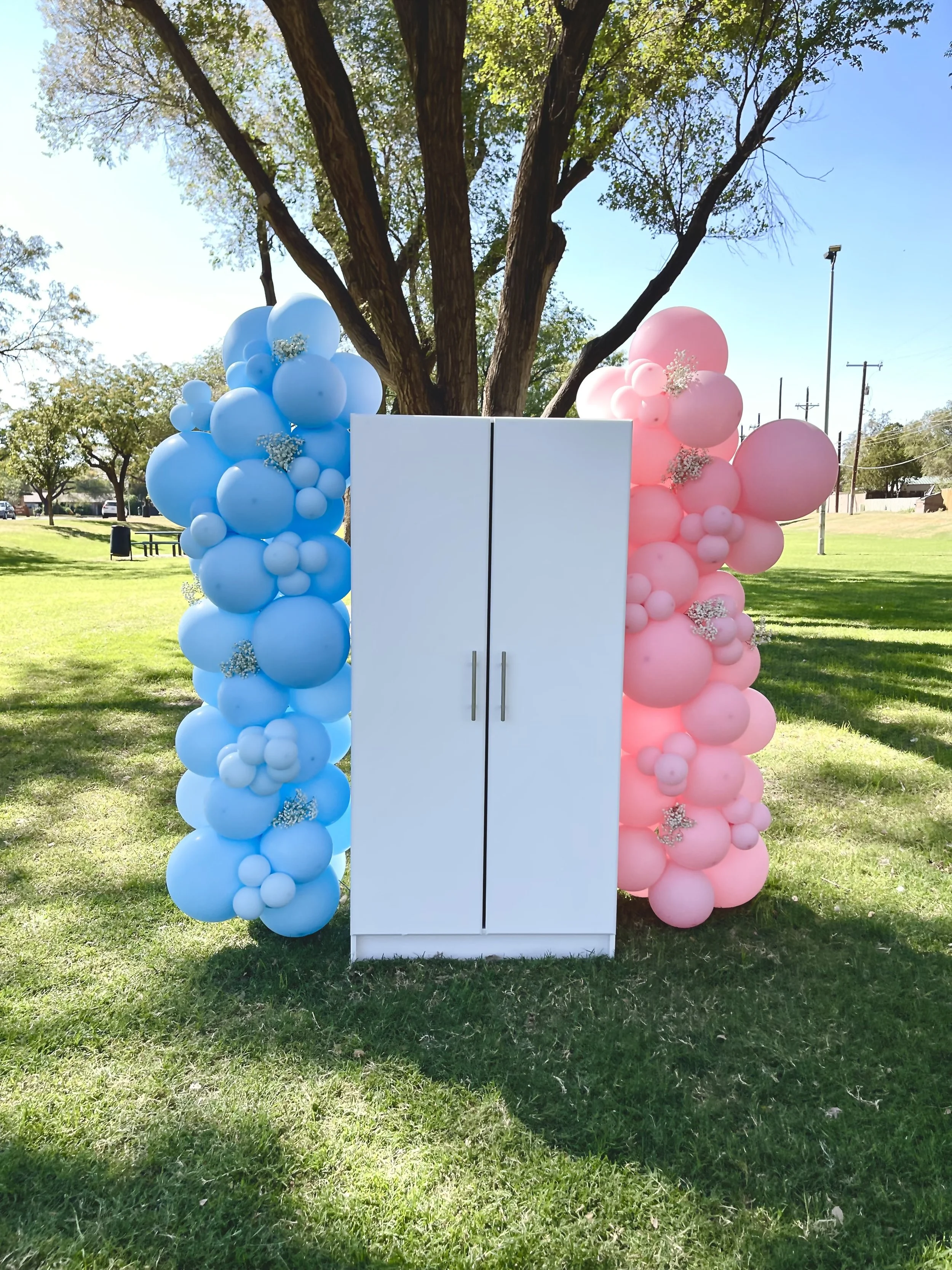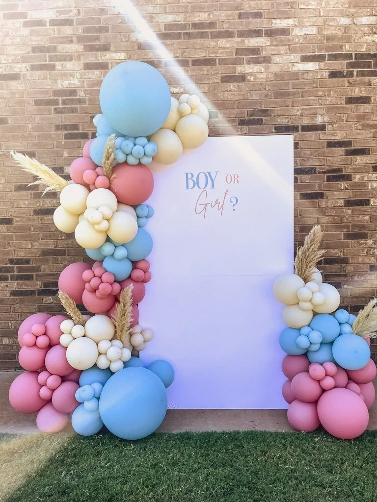 Gender reveal setup with pink, blue, and beige balloons against a brick wall, featuring a sign that says "Boy or Girl?" and pampas grass accents.