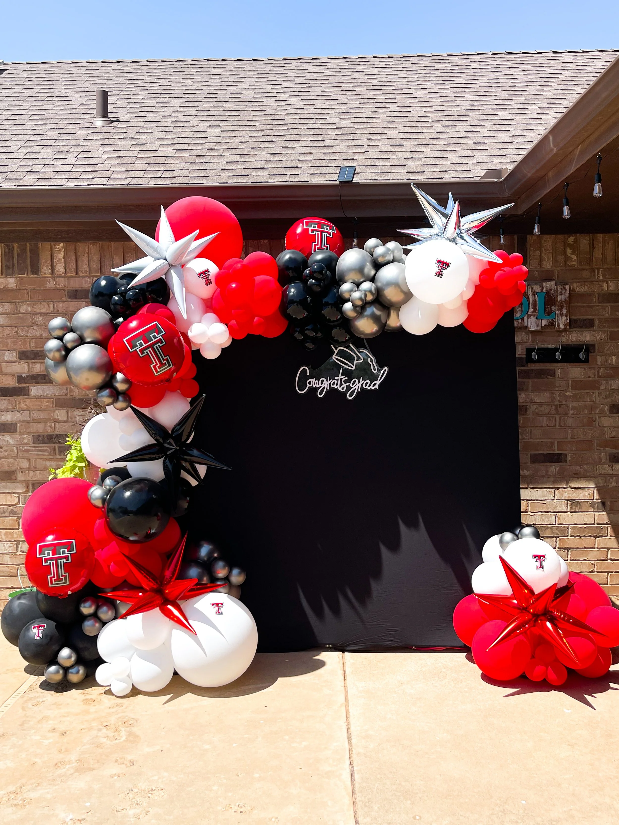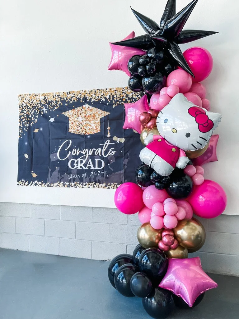 Graduation party setup with a "Congrats Grad" banner for the Class of 2024, featuring a colorful balloon arrangement including pink, black, and gold balloons, and a cartoon cat balloon decoration.