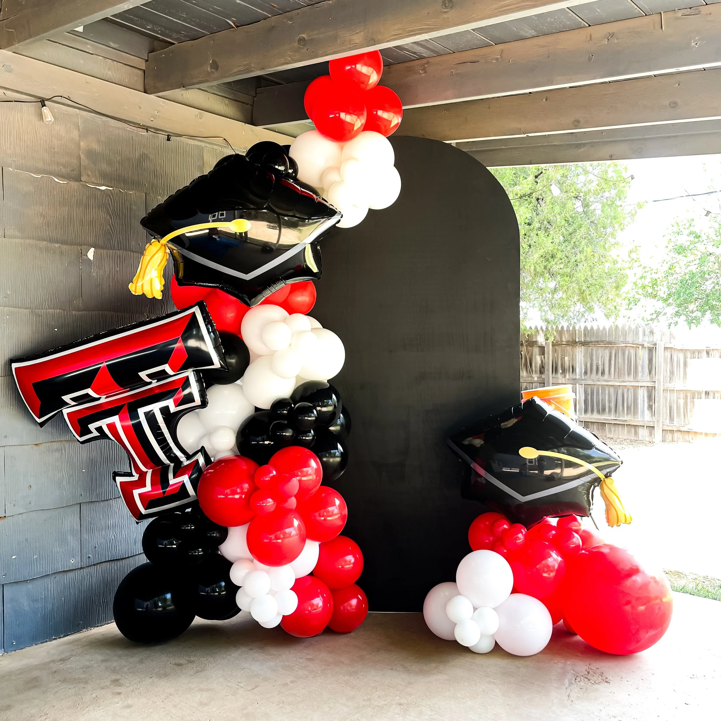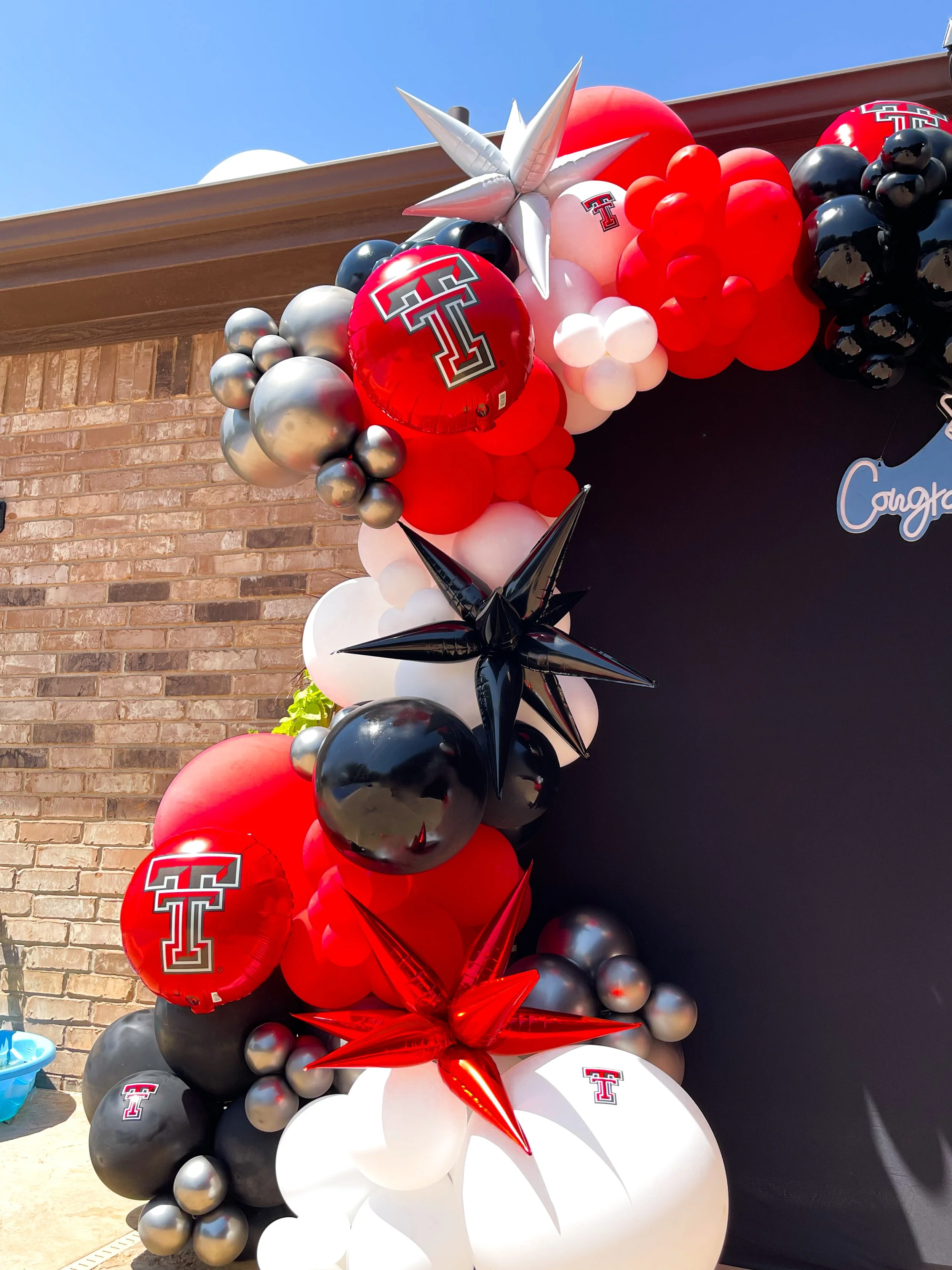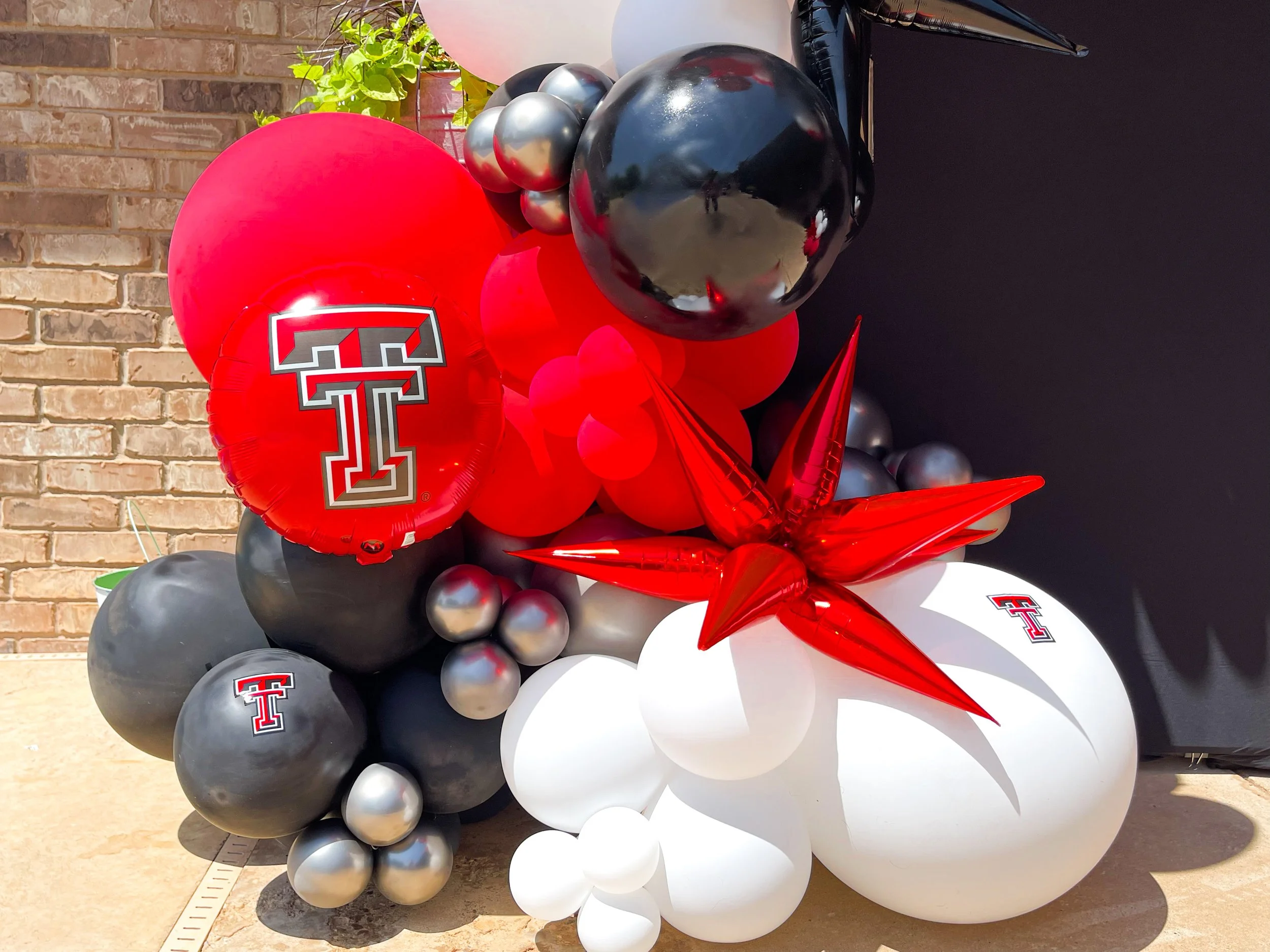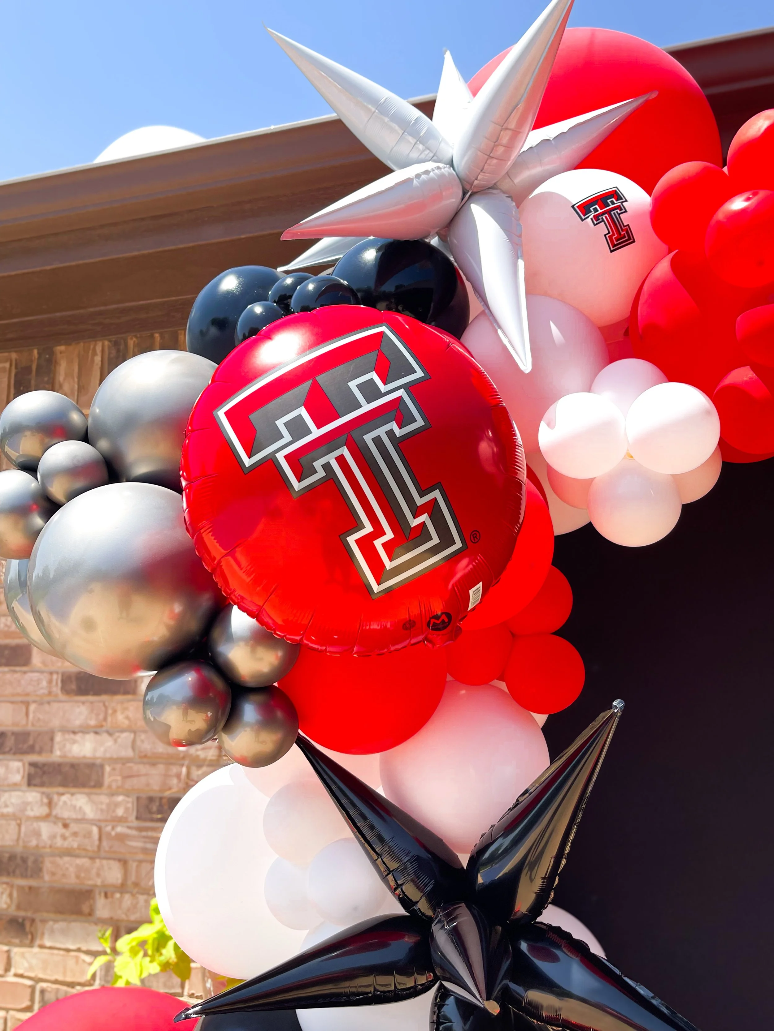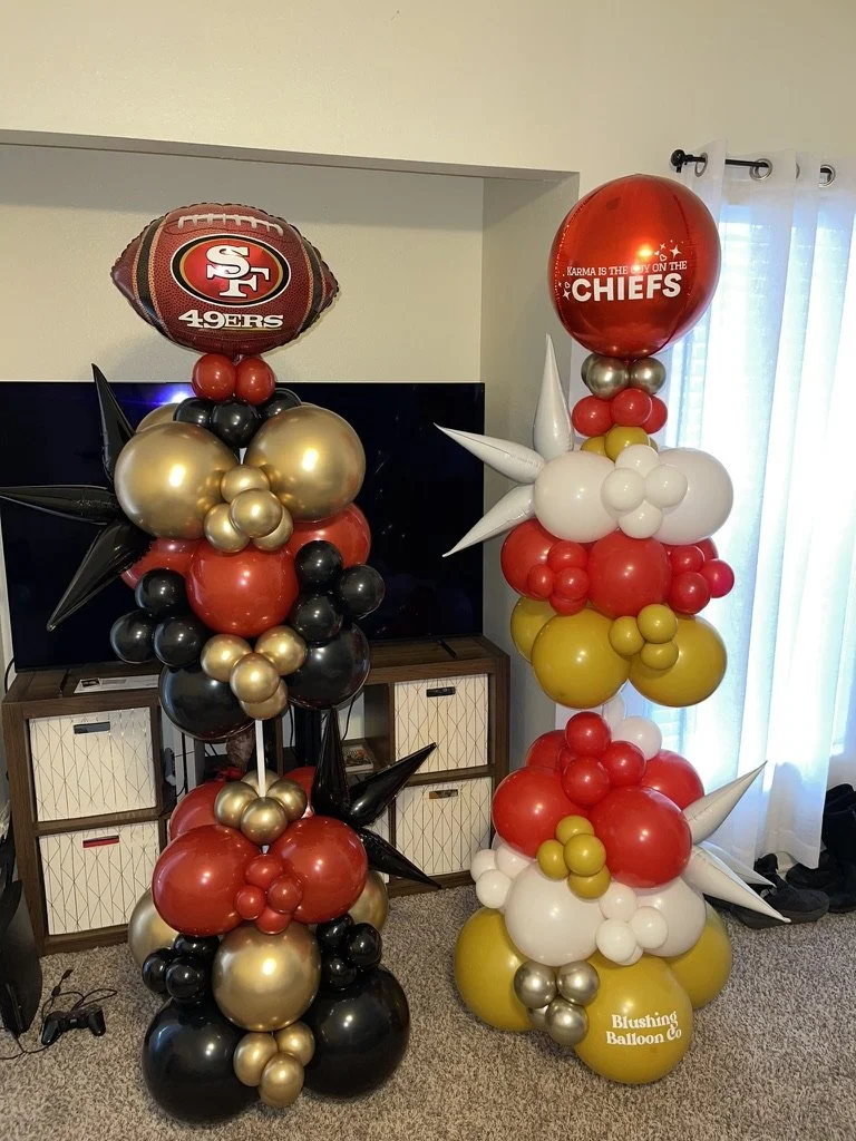 Two balloon columns with football themes, one featuring a 49ers football and the other a Chiefs themed balloon, with colors red, gold, black, and white.