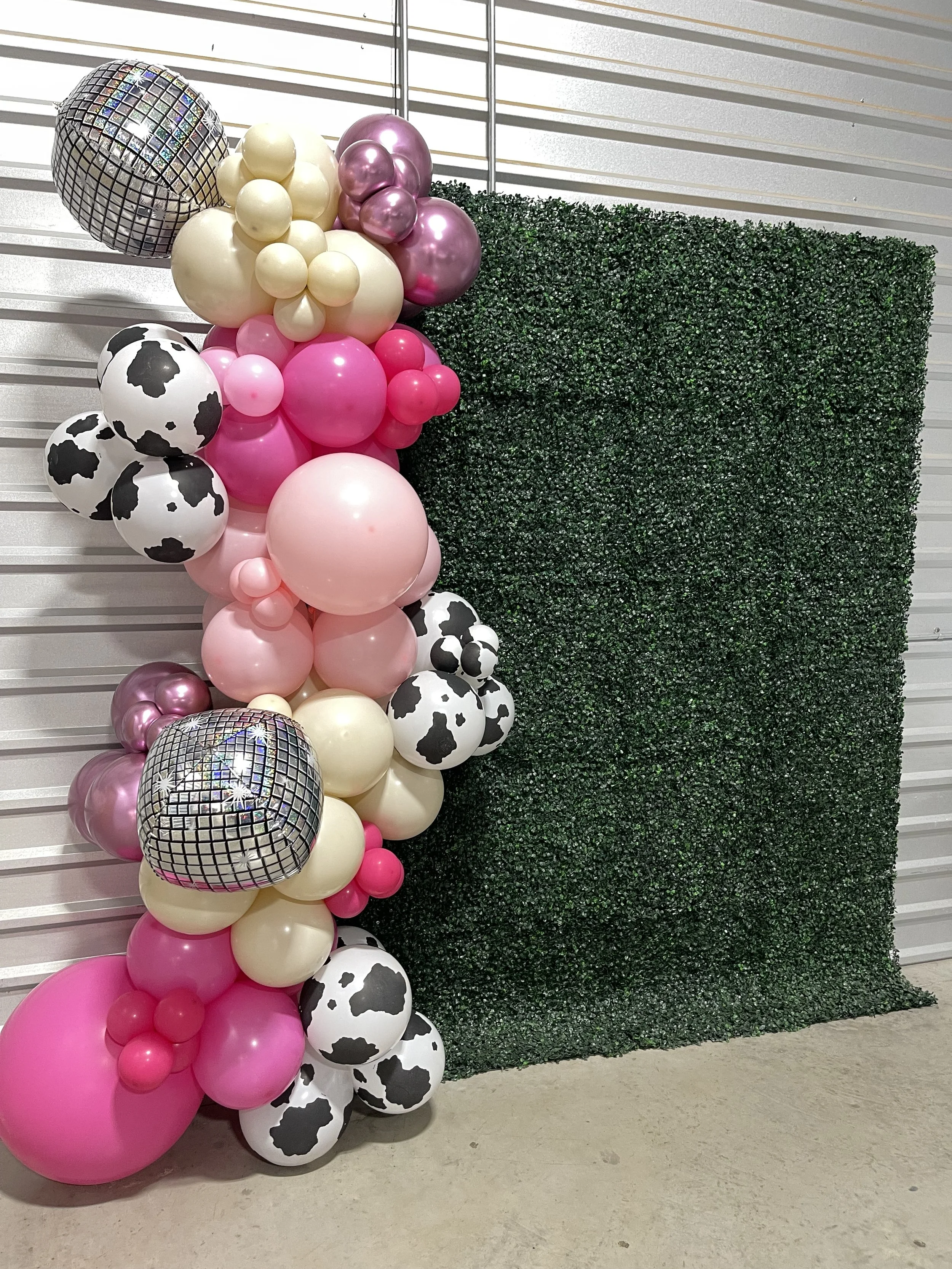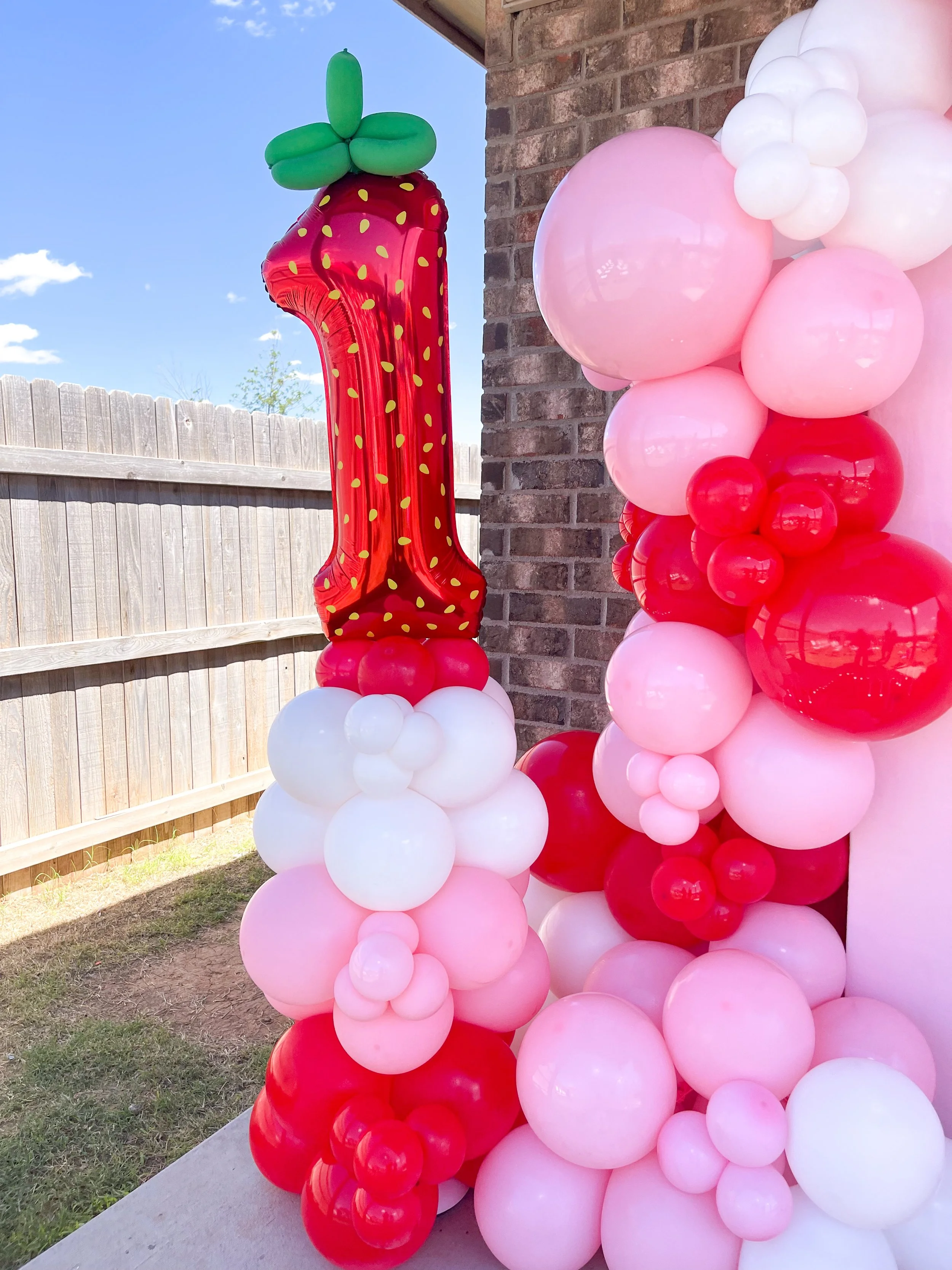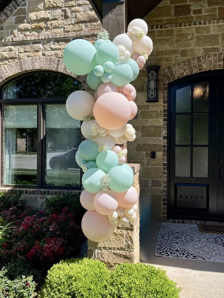 Pastel balloon arrangement with greenery outside a brick house entrance.