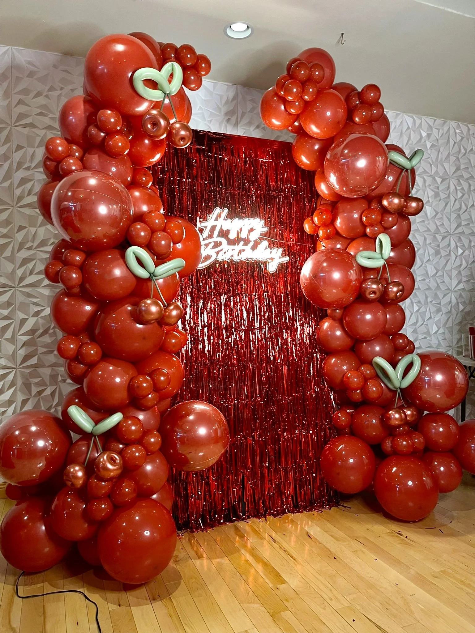 Red balloon arch with "Happy Birthday" neon sign against red tinsel backdrop on wooden floor.