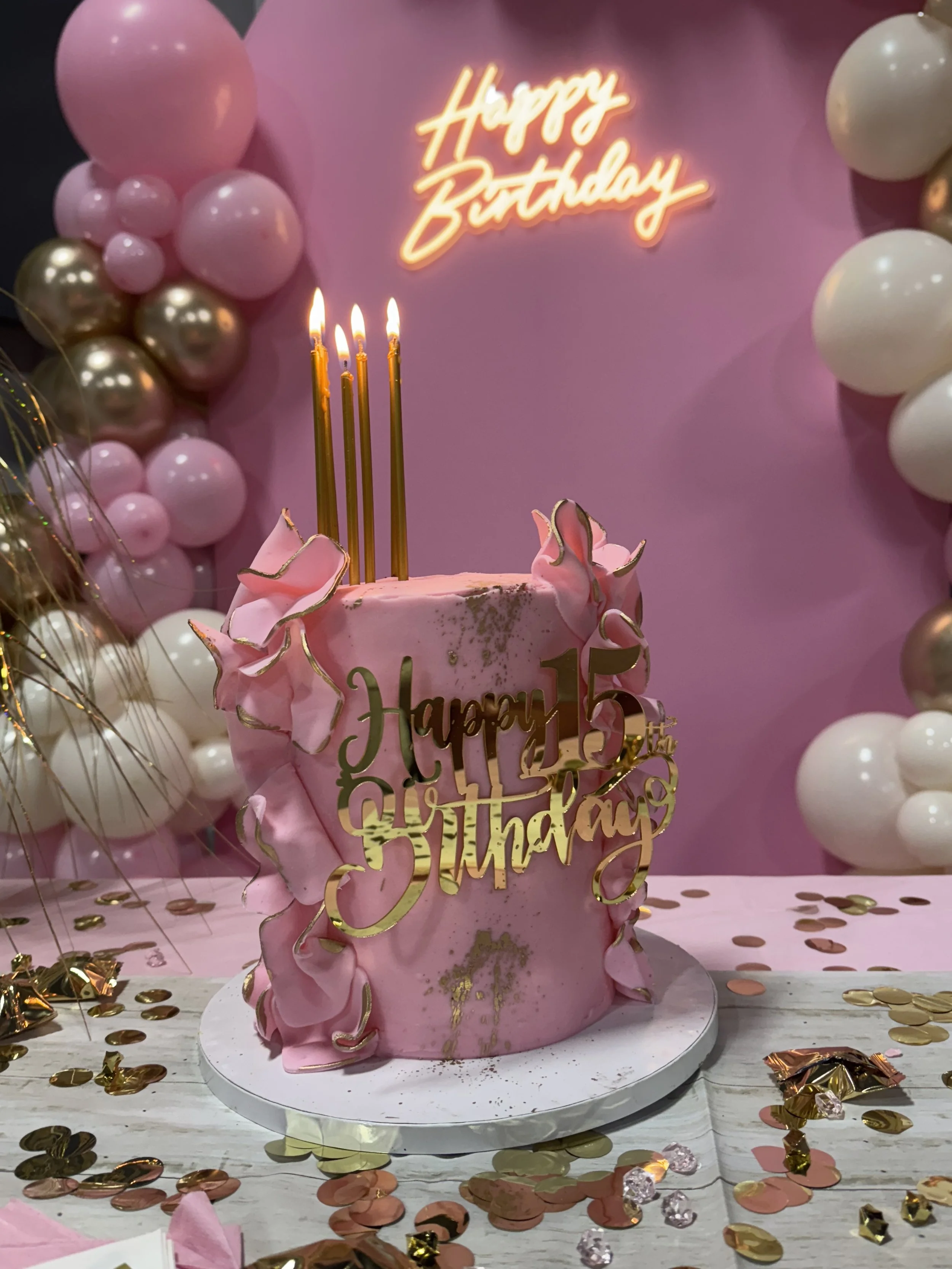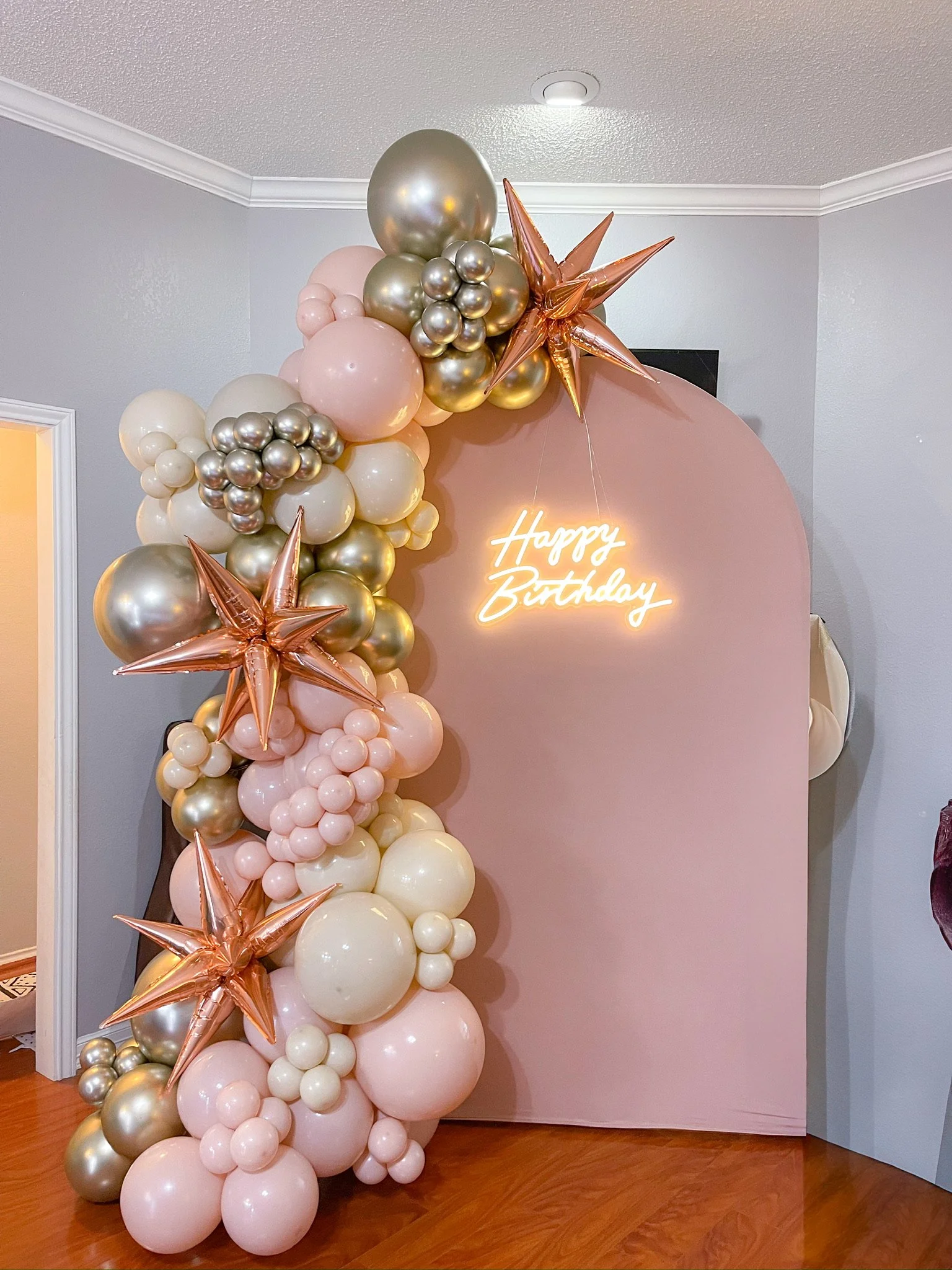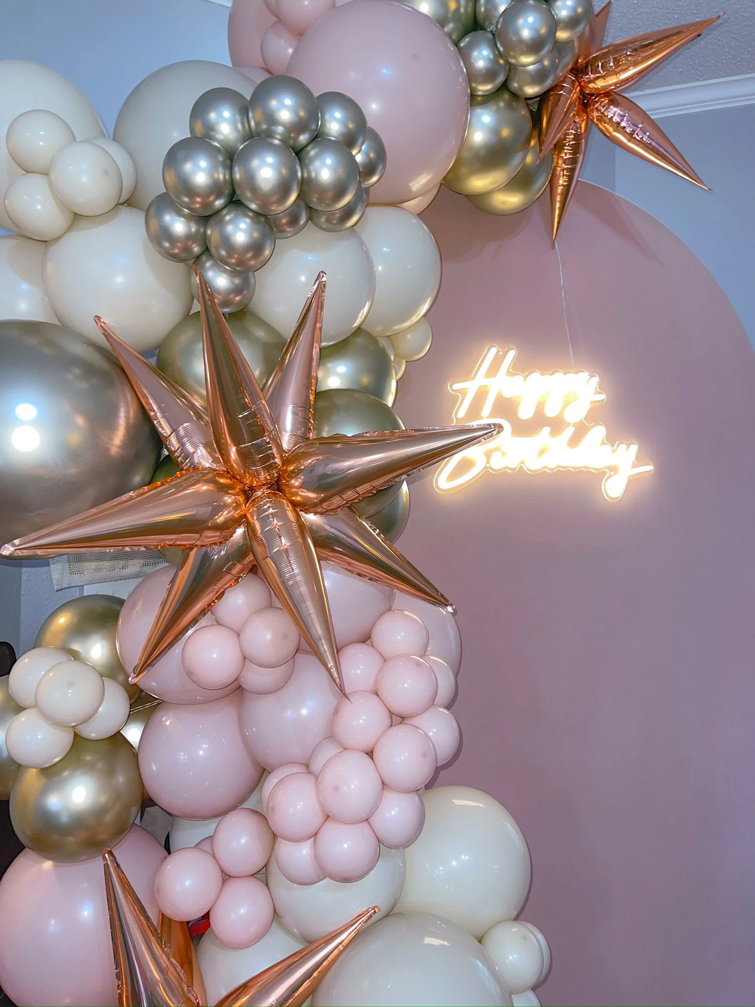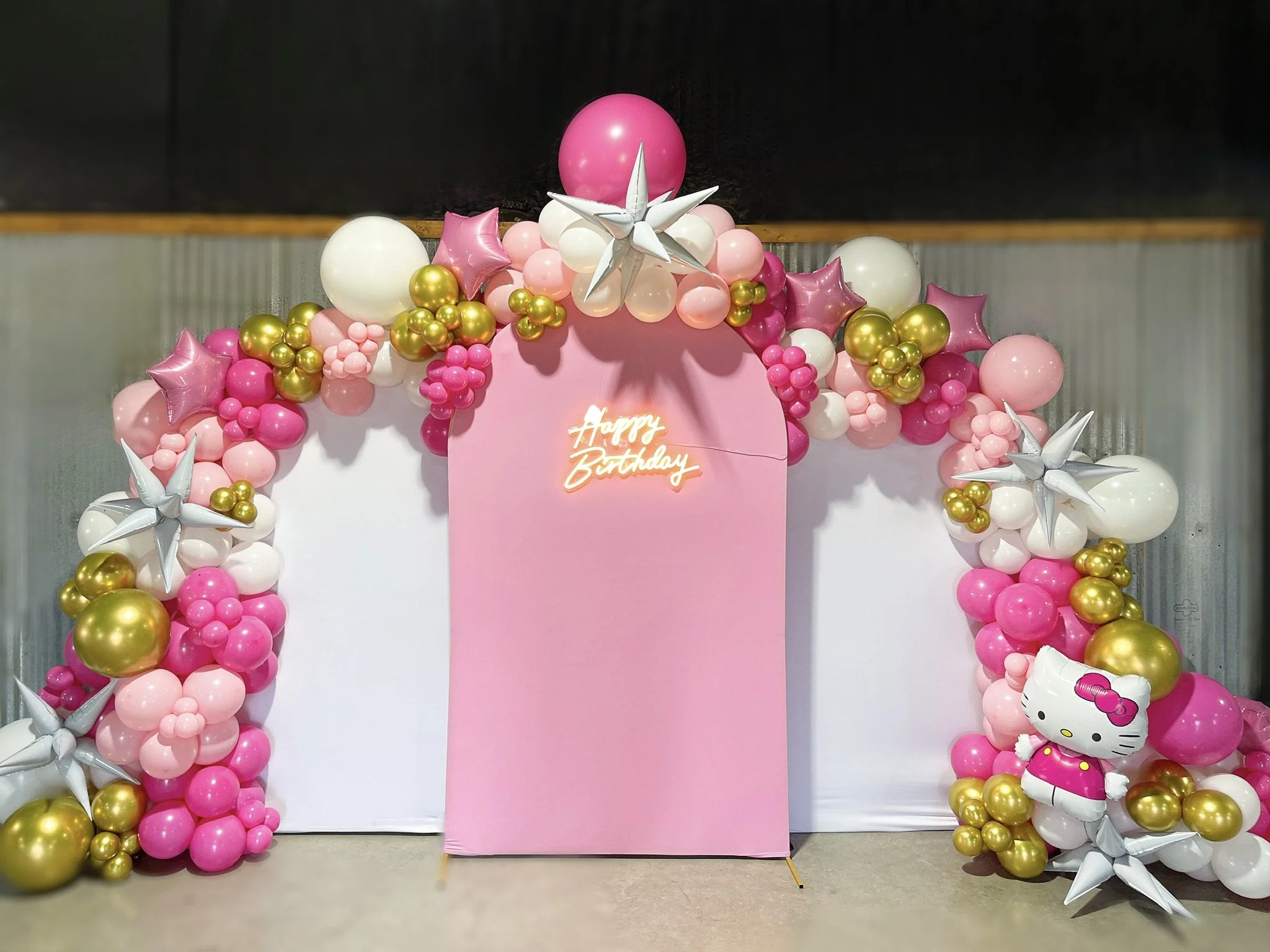 Balloon arch with pink, white, and metallic balloons, star-shaped metallic balloons, and a neon 'Happy Birthday' sign.