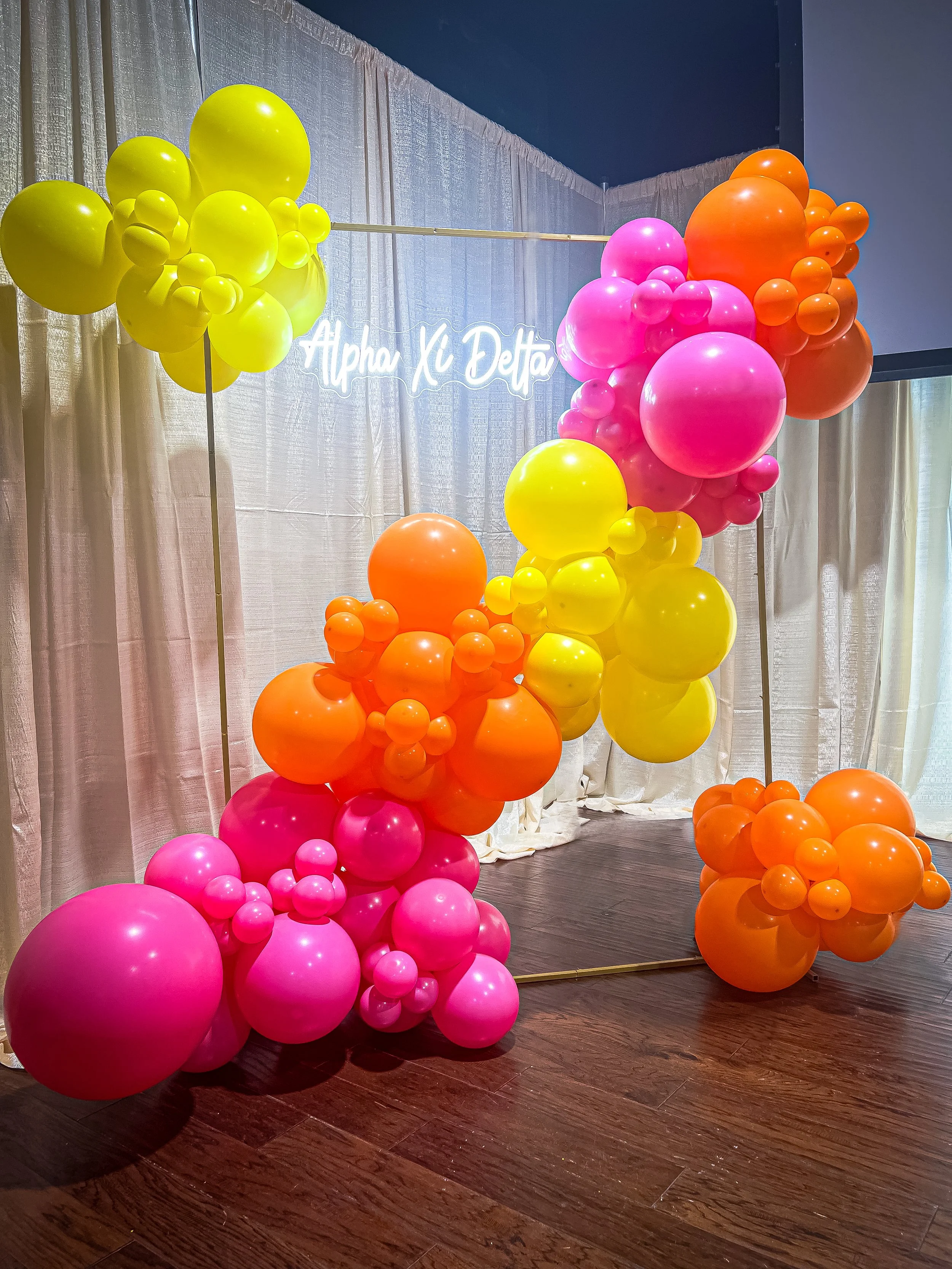 Balloon garland with daisies and sunset colors beside a wooden backdrop and "Hello Sunshine" neon sign in a room with brick walls and wooden blinds. View fullsize