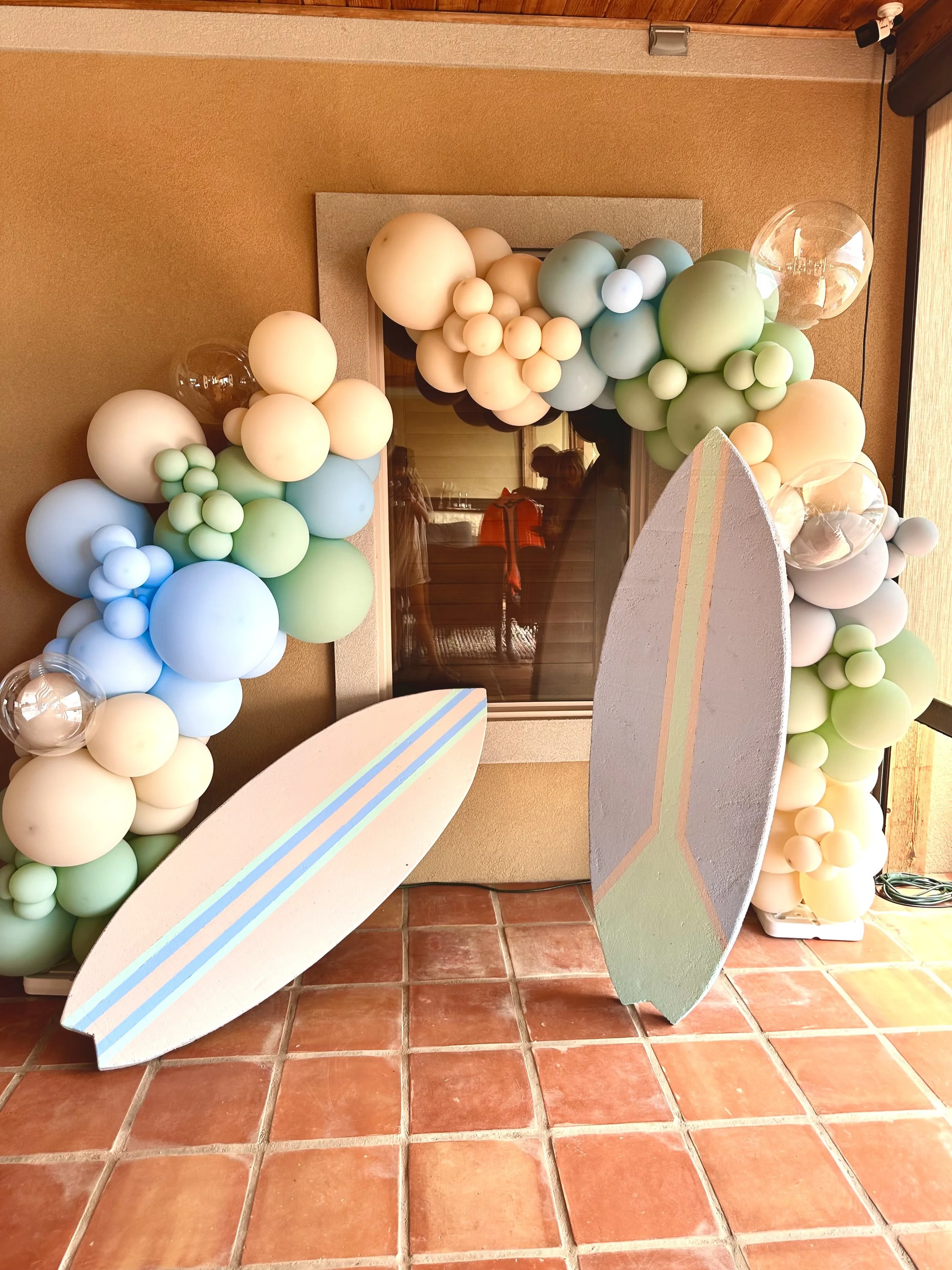 Pastel balloon arrangement with greenery outside a brick house entrance. View fullsize