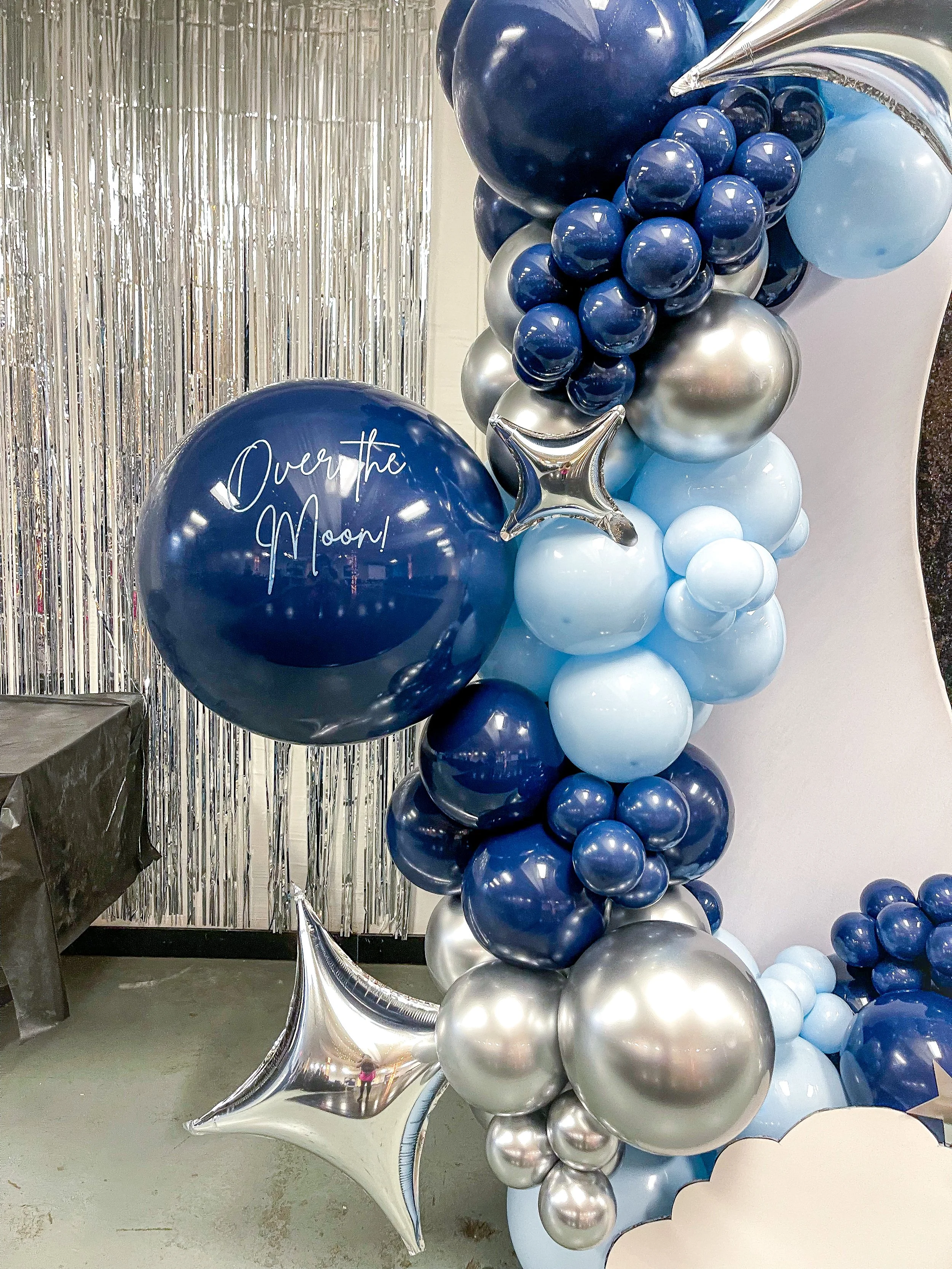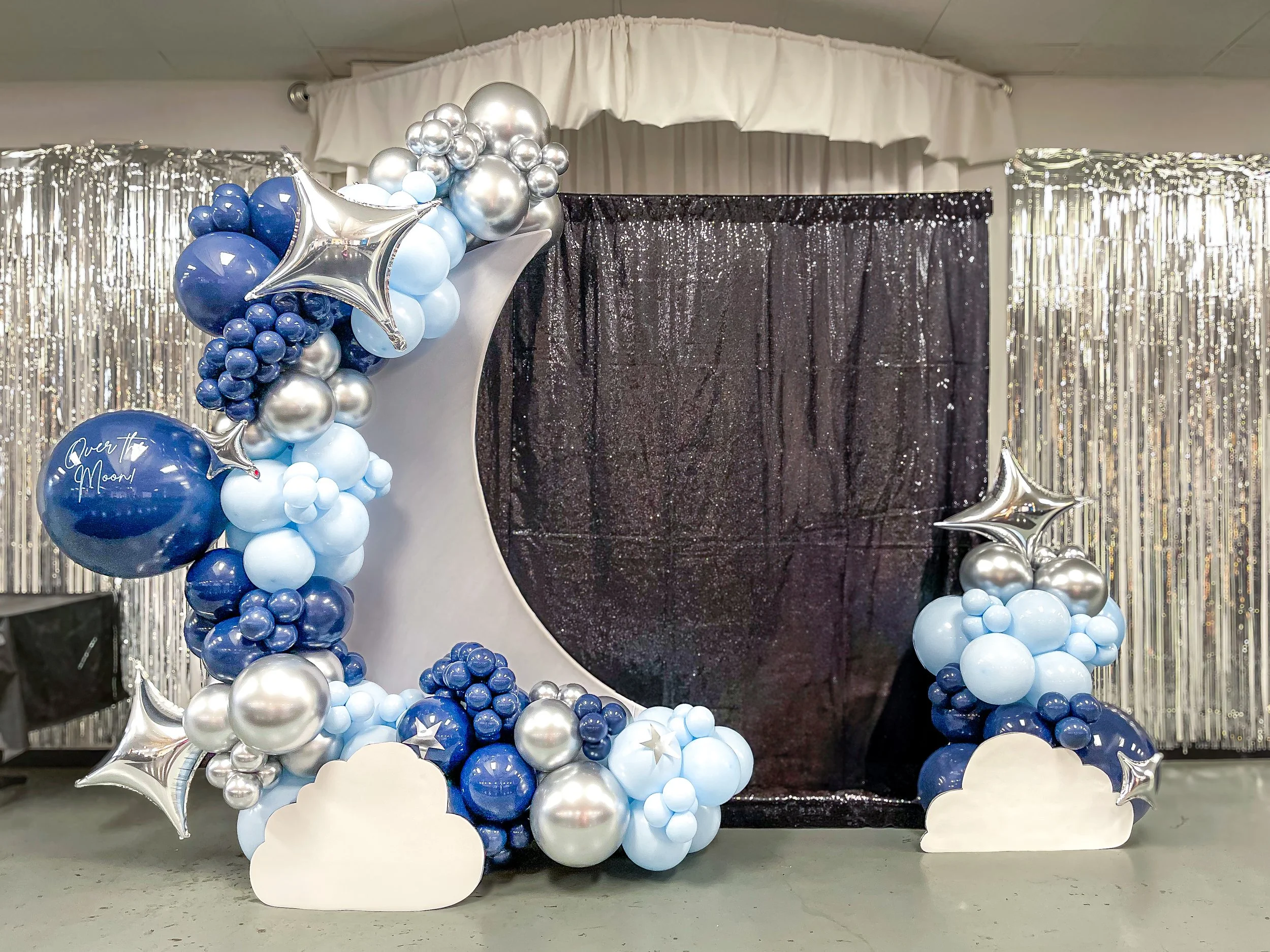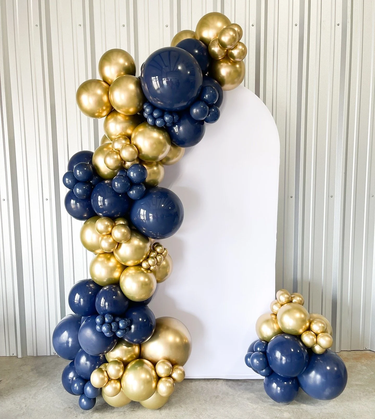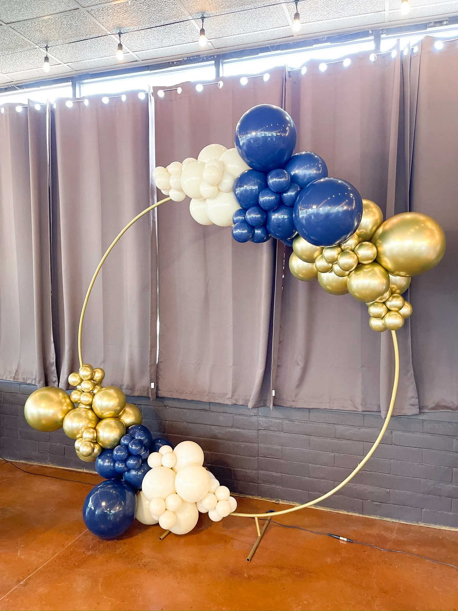 Balloon decoration featuring a gold hoop with clusters of gold, navy blue, and white balloons against gray curtains.