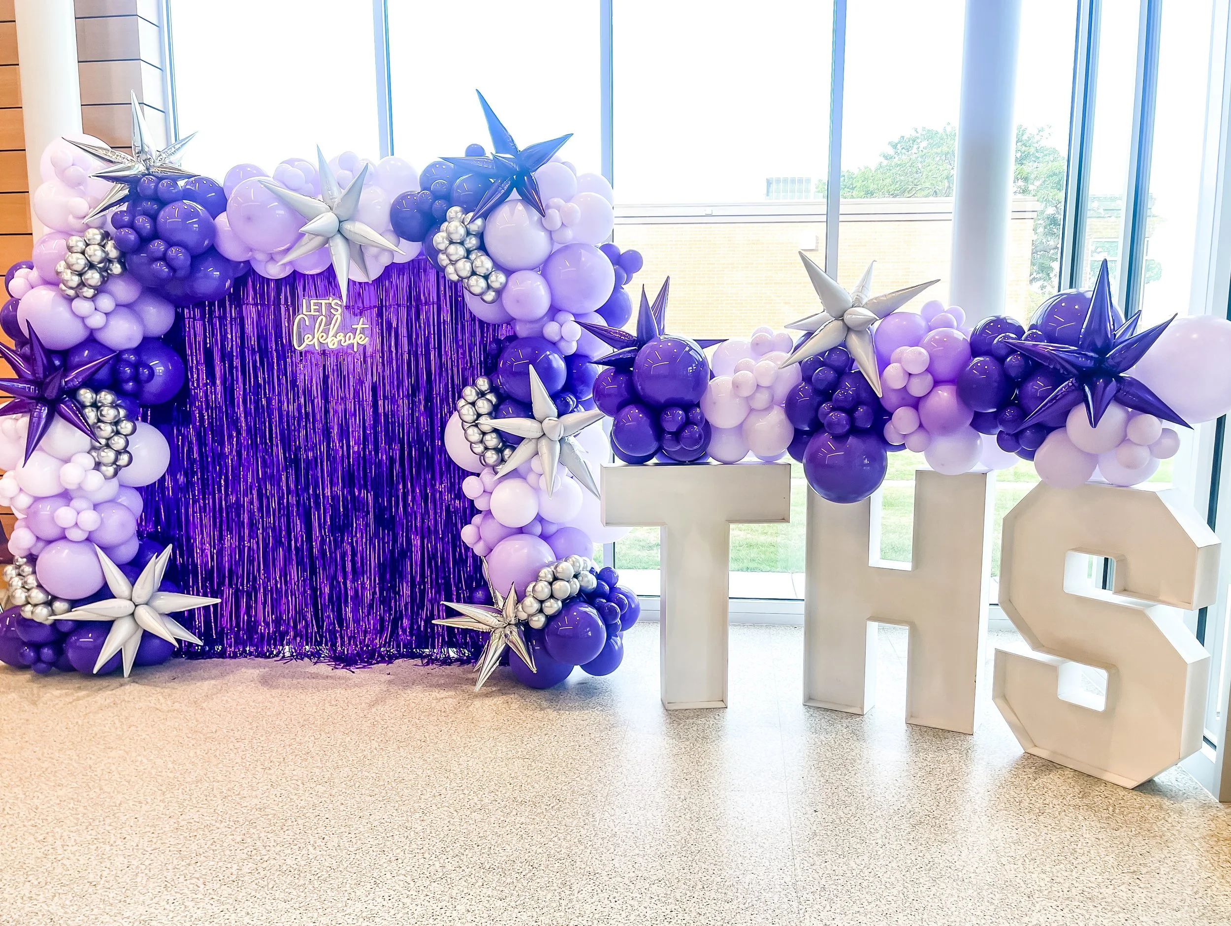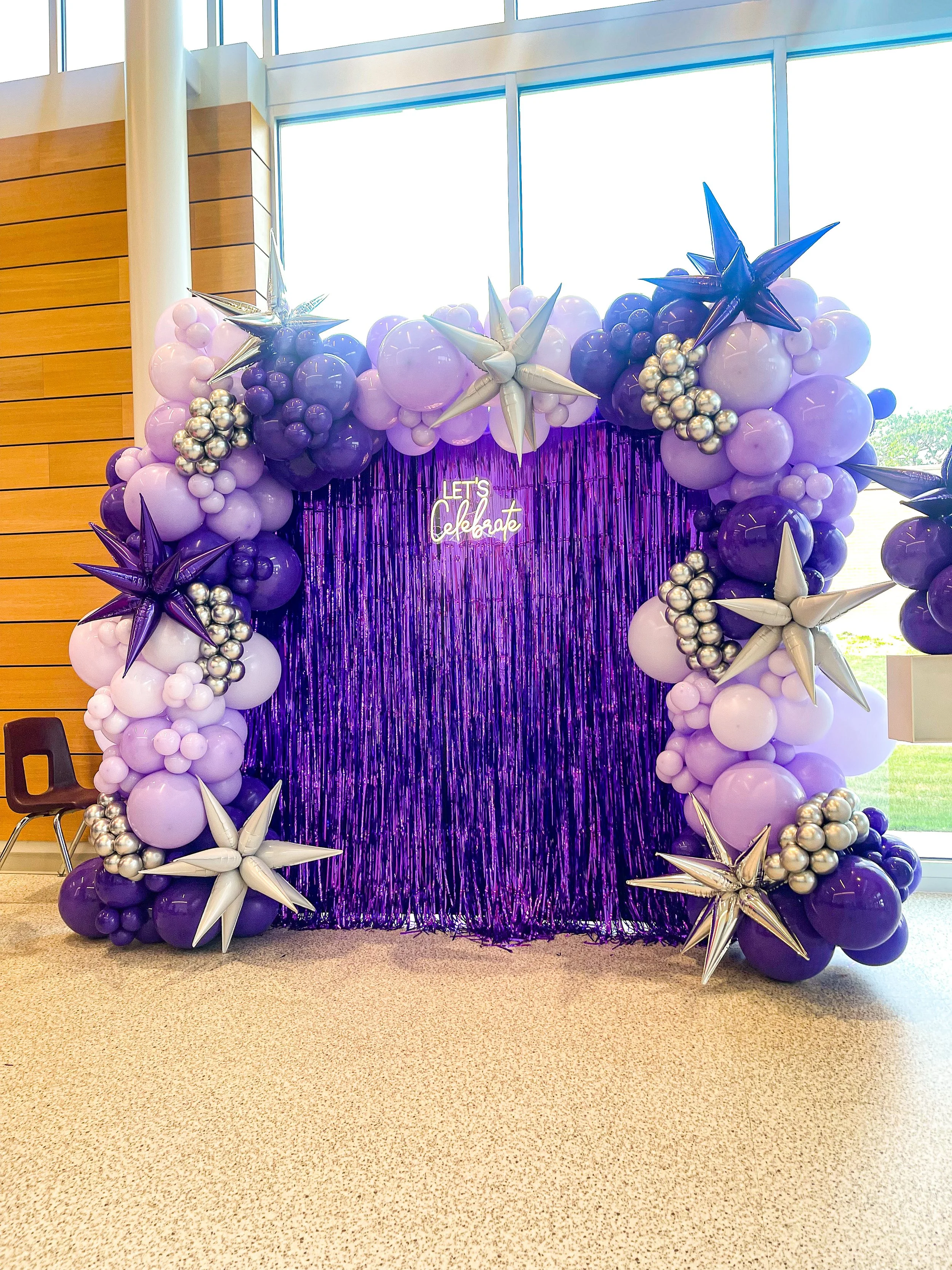 Balloon arch with metallic and pastel colors, featuring star-shaped balloons and a neon 'Happy Birthday' sign on a pink backdrop.