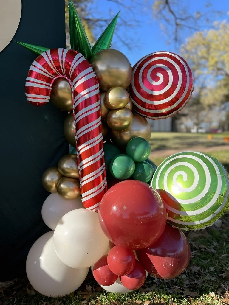 A festive balloon arrangement featuring a red and white striped candy cane, gold and red balloons, and green peppermint candy-shaped balloons, set against an outdoor setting. The balloons form a decorative cluster with a holiday theme.