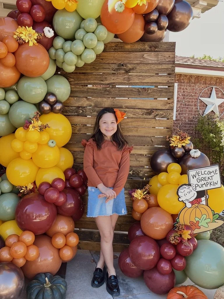 Young girl standing in front of a colorful balloon arch with fall-themed decorations, including pumpkins and flowers. Sign reads "Welcome Great Pumpkin."