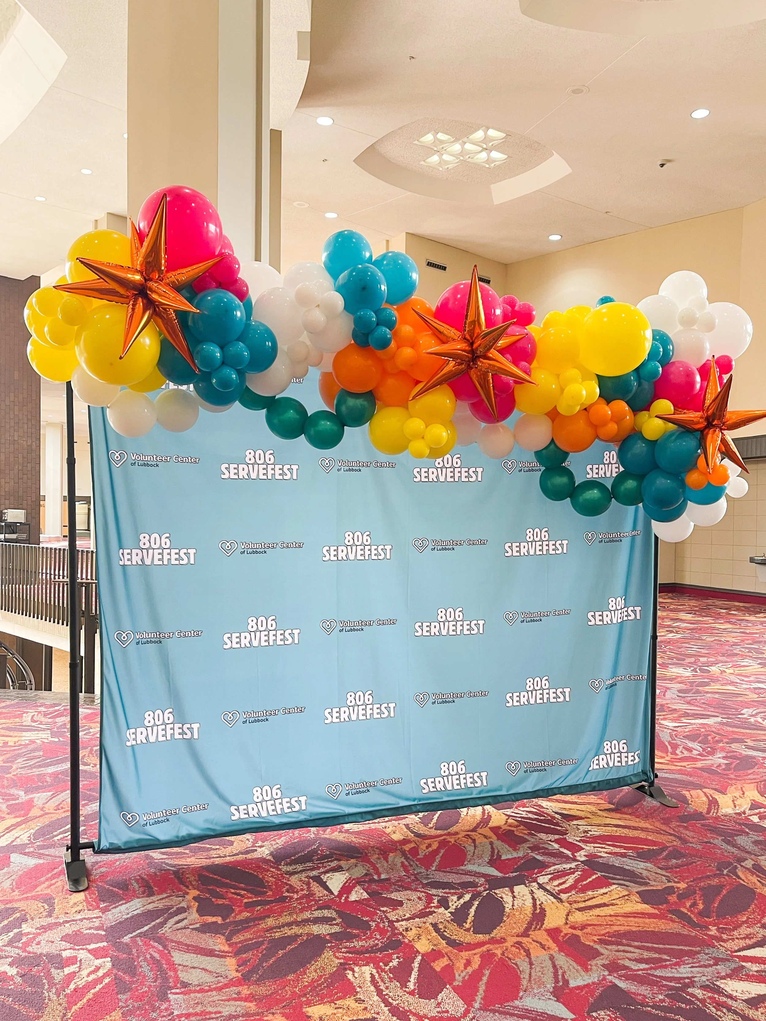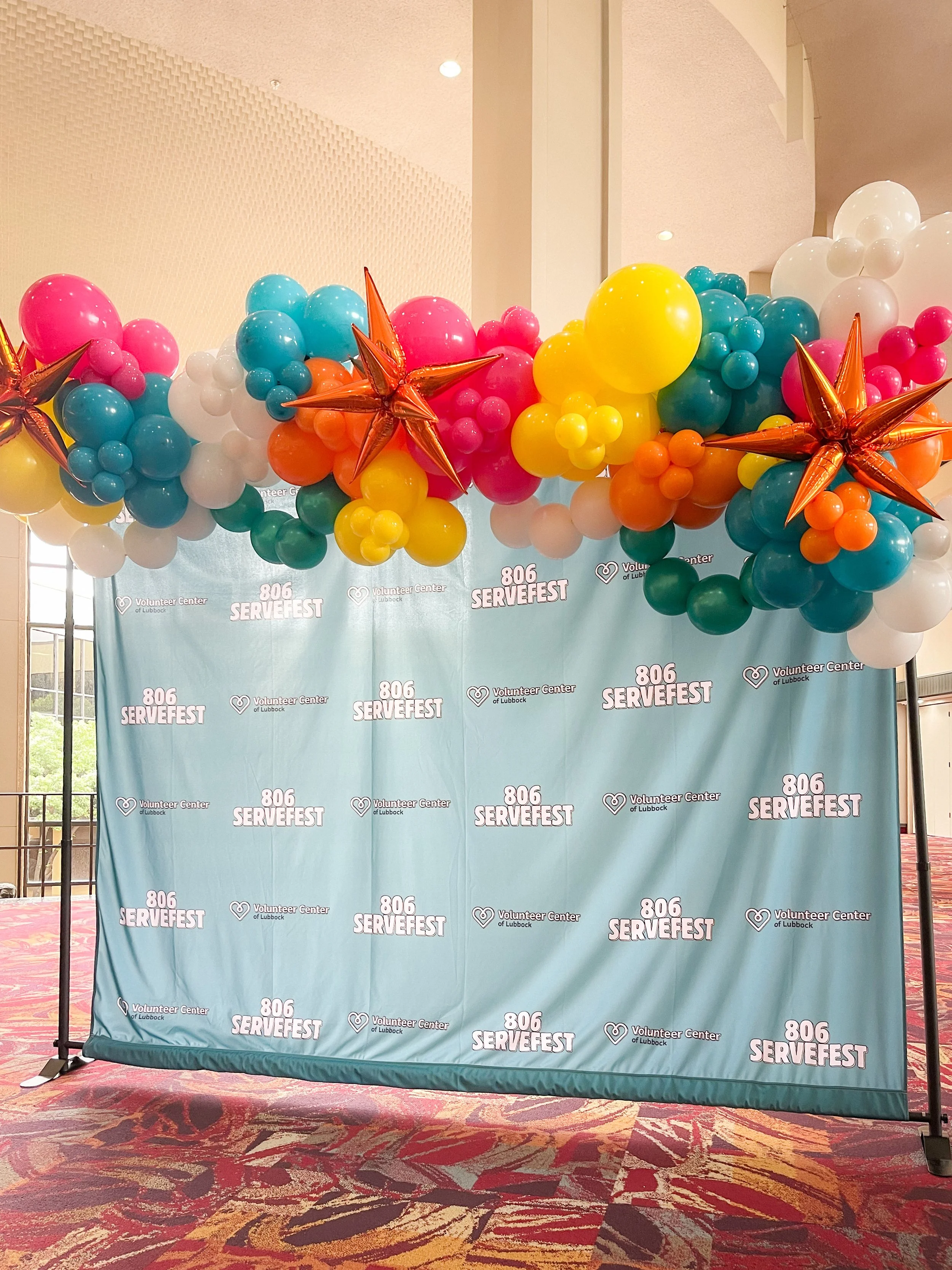 Backdrop with company logo and balloon arch decorations in red, green, and gold. View fullsize