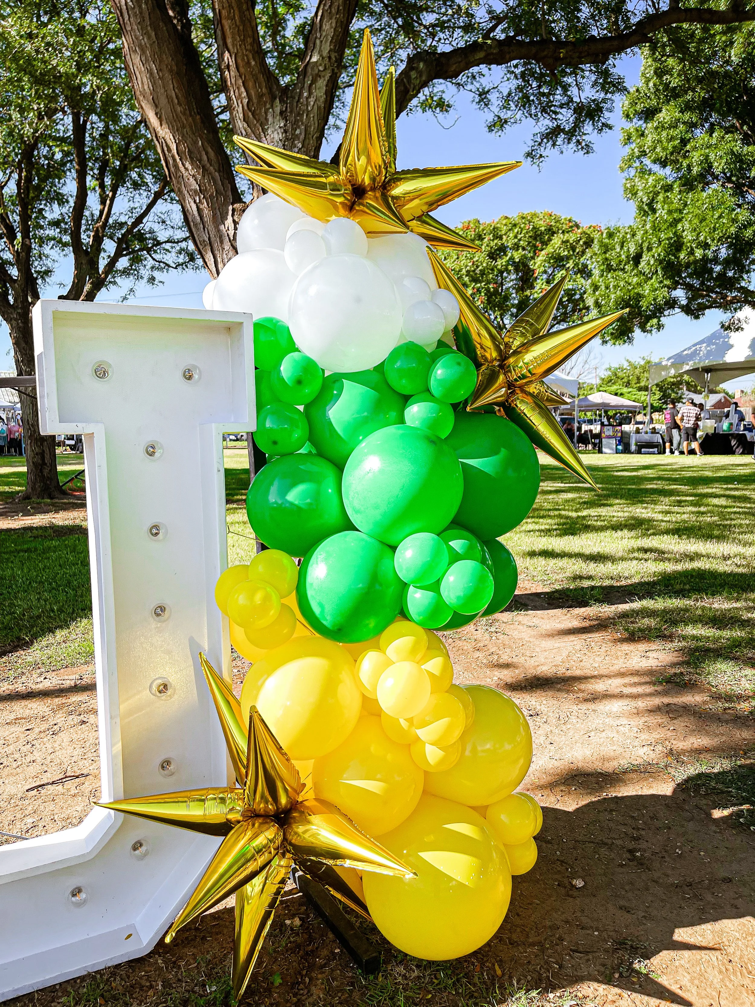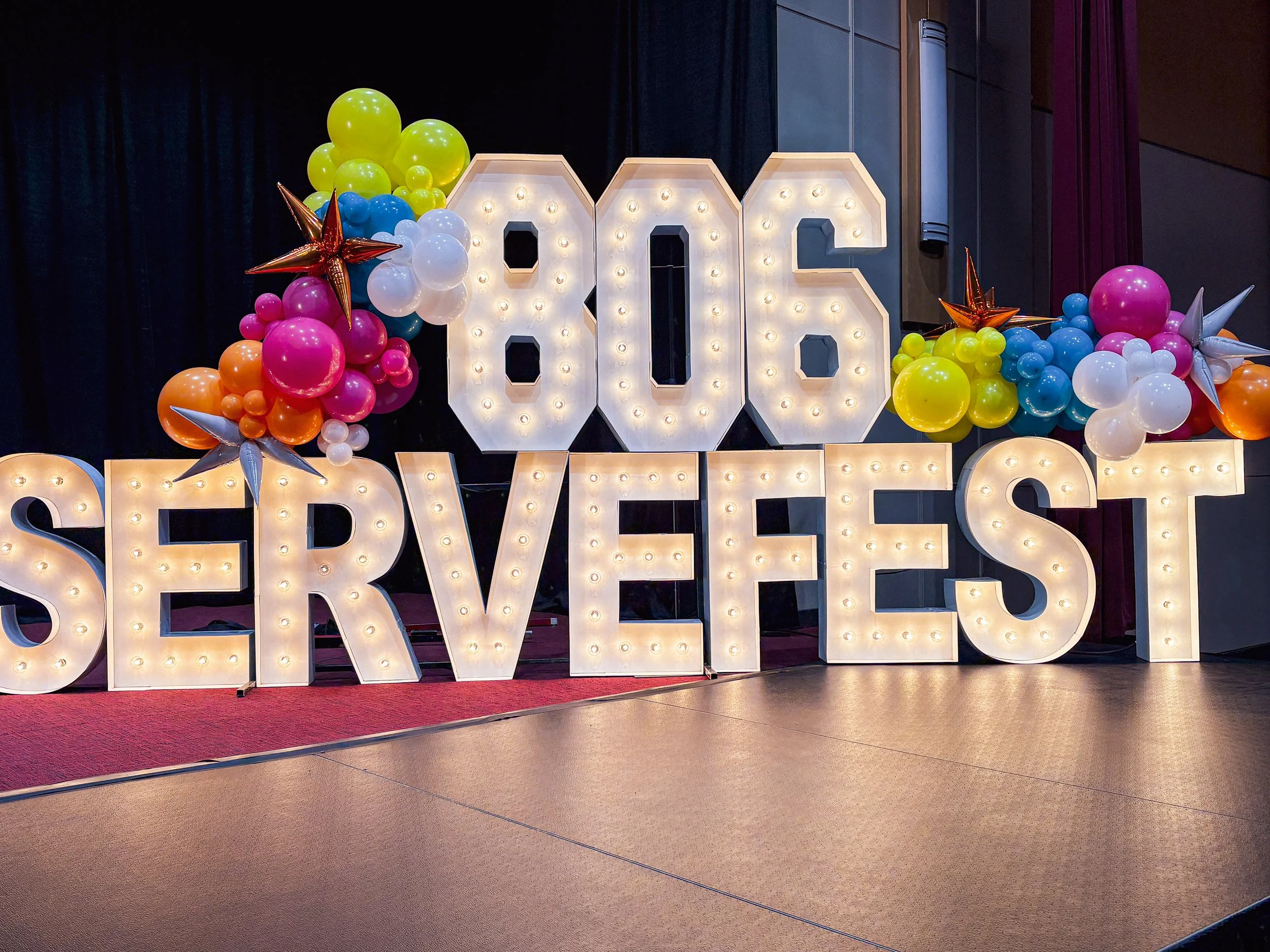 Decorative balloon arch with gold, green, and white balloons beside a sign that reads 'Better Together' in neon lights. Background features wooden paneling and string lights.