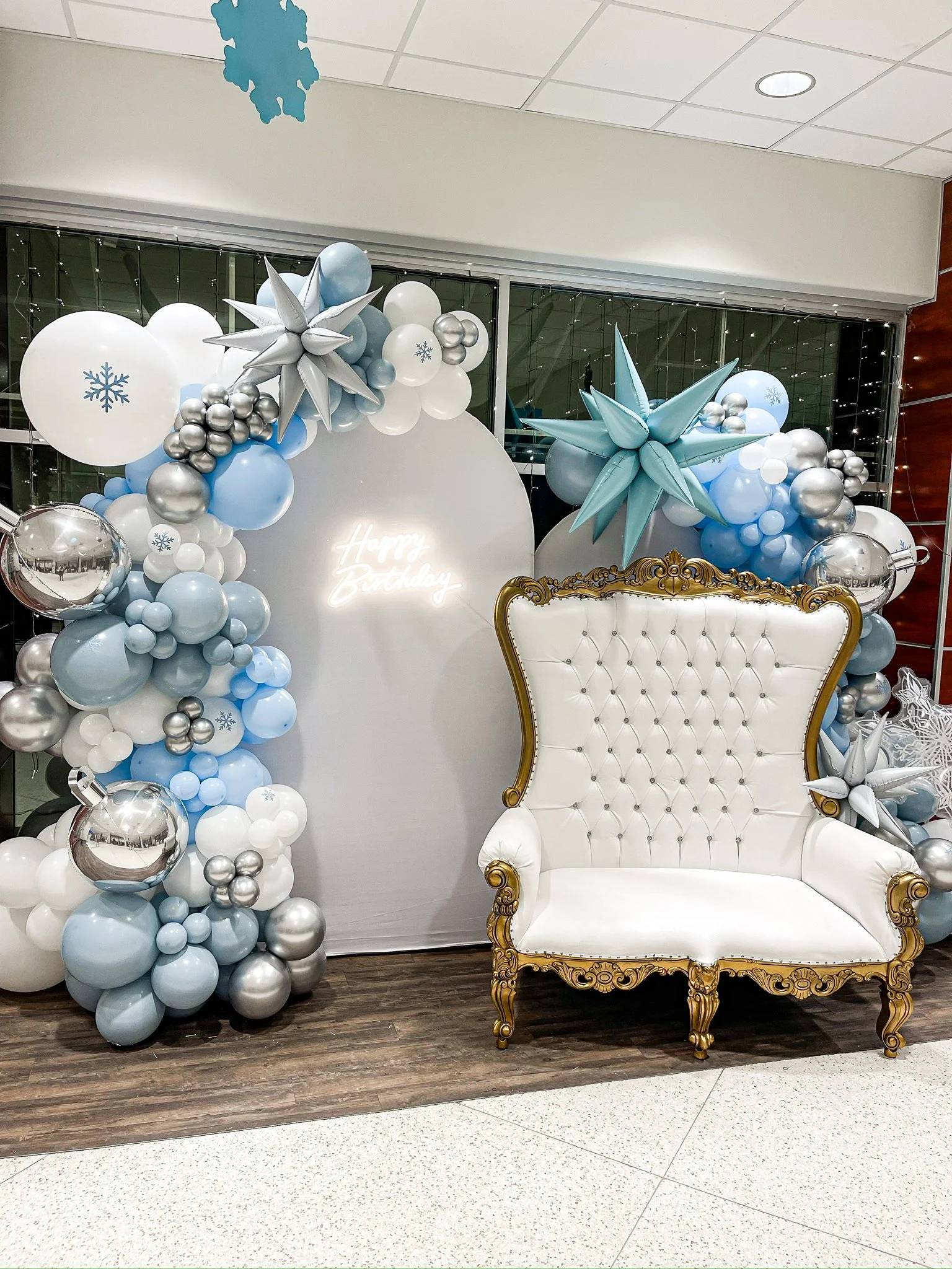 Elegant birthday photo backdrop with light blue, white, and silver balloon arch, large decorative chair, snowflake decorations, and "Happy Birthday" neon sign.