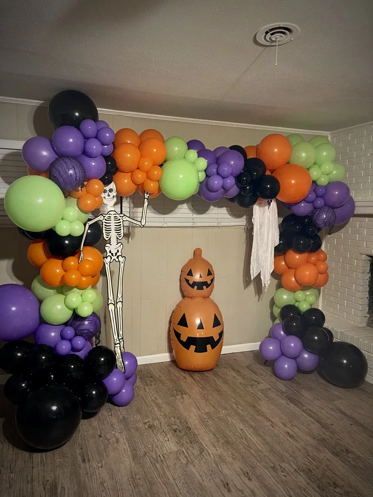 Halloween-themed balloon arch with skeleton and inflatable jack-o'-lanterns indoors