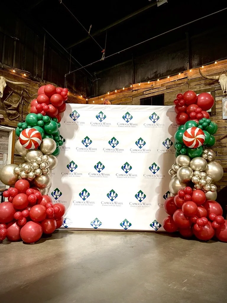 Backdrop with company logo and balloon arch decorations in red, green, and gold.