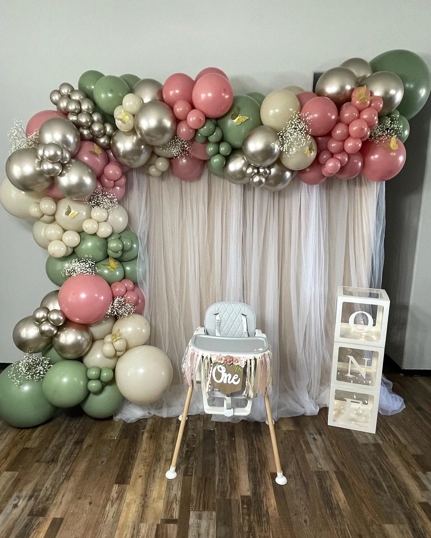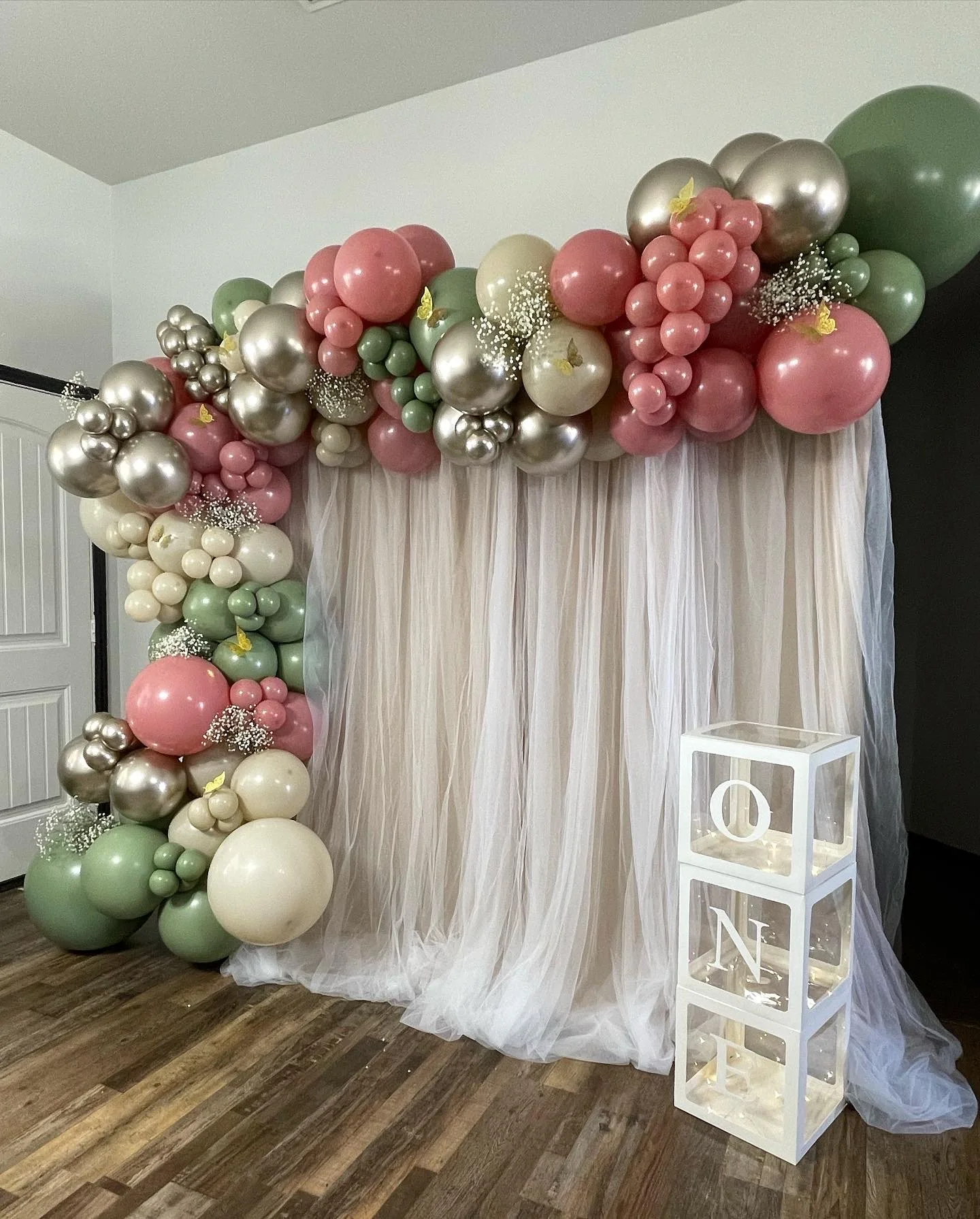 Balloon arch in pastel colors, including pink, green, and gold, with a white sheer curtain backdrop. Clear boxes stacked vertically spell "ONE" in white letters. Decorated with small flowers and butterflies.