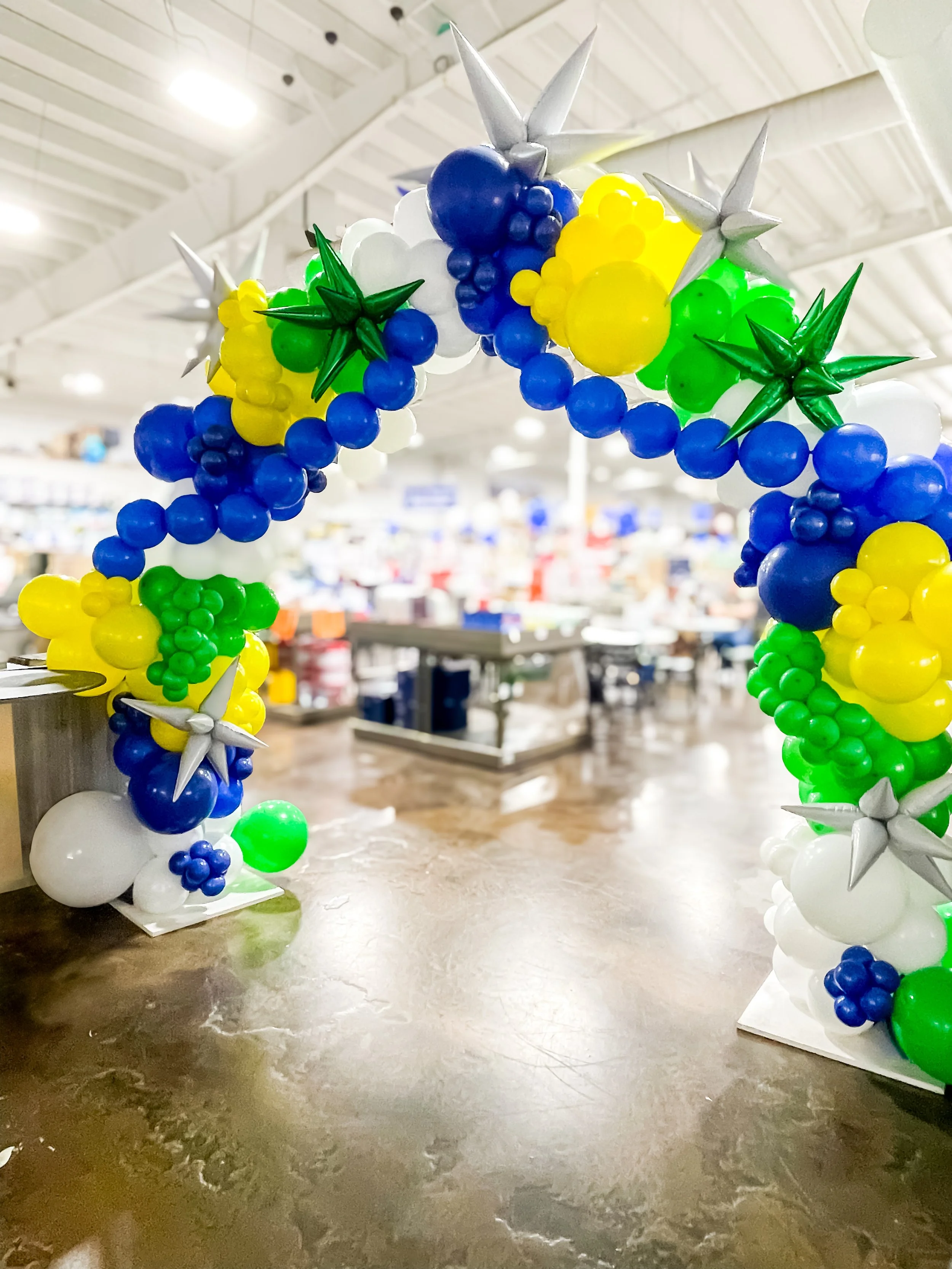 Balloon archway at Camping World entrance with blue, white, and silver balloons. View fullsize