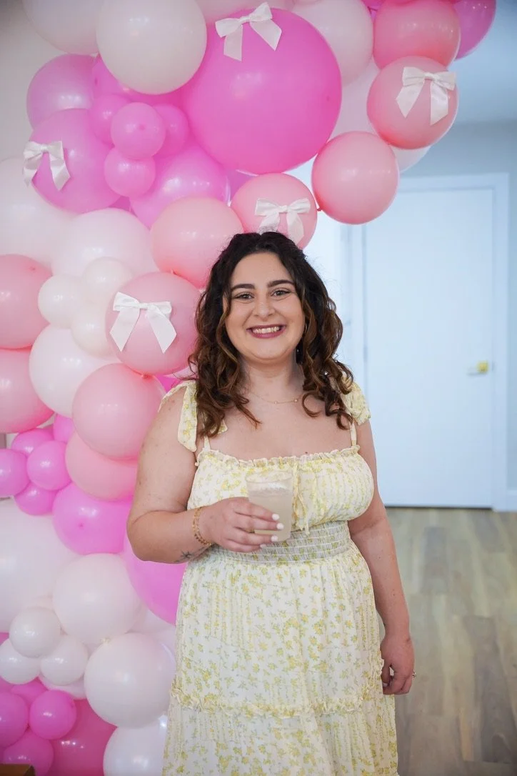 Woman in a yellow floral dress holding a drink, standing in front of a backdrop of pink and white balloons with bows.