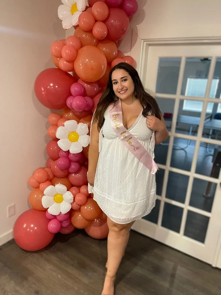 A woman wearing a white dress and a "bride to be" sash stands in front of a colorful floral balloon decoration.