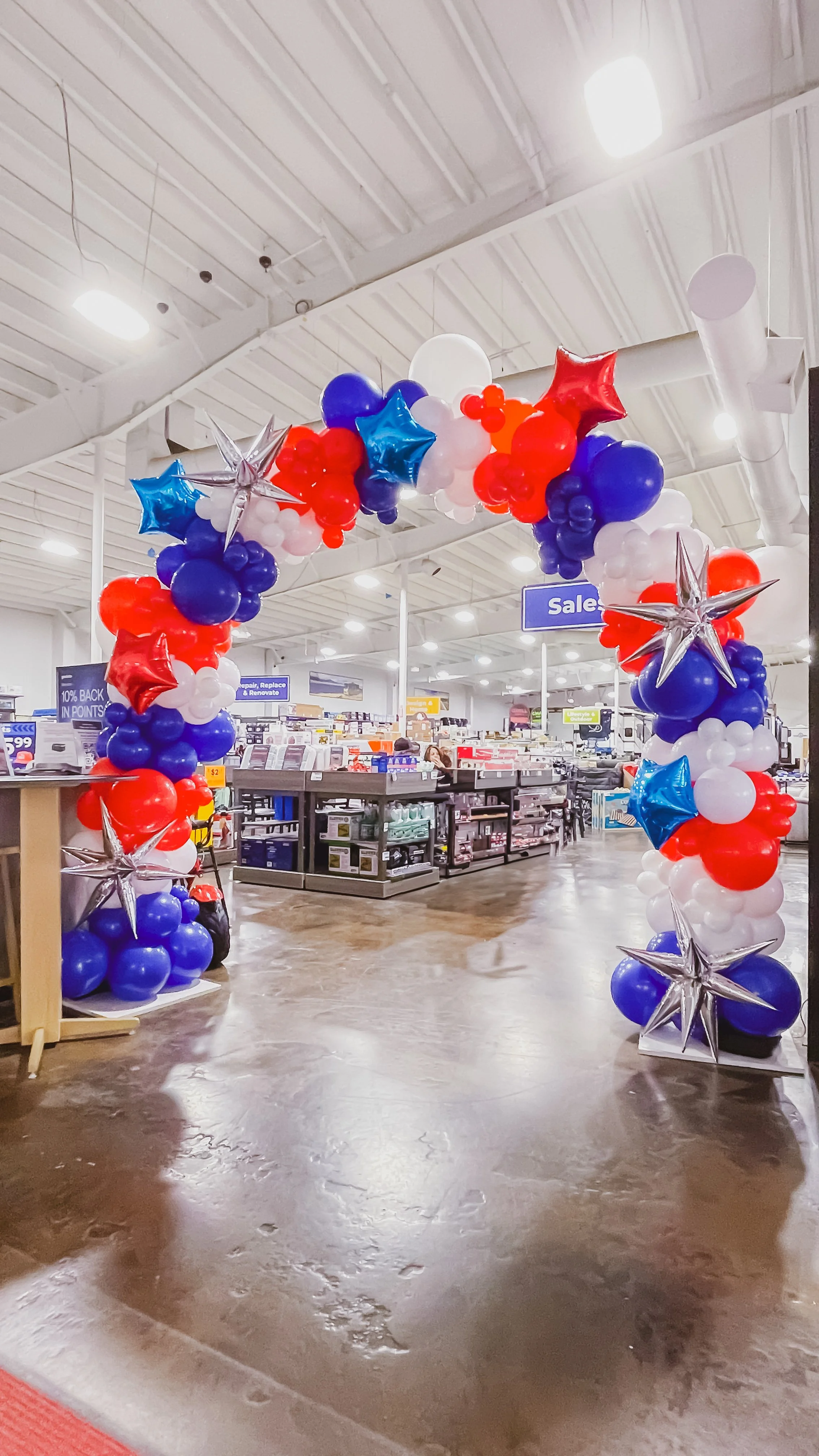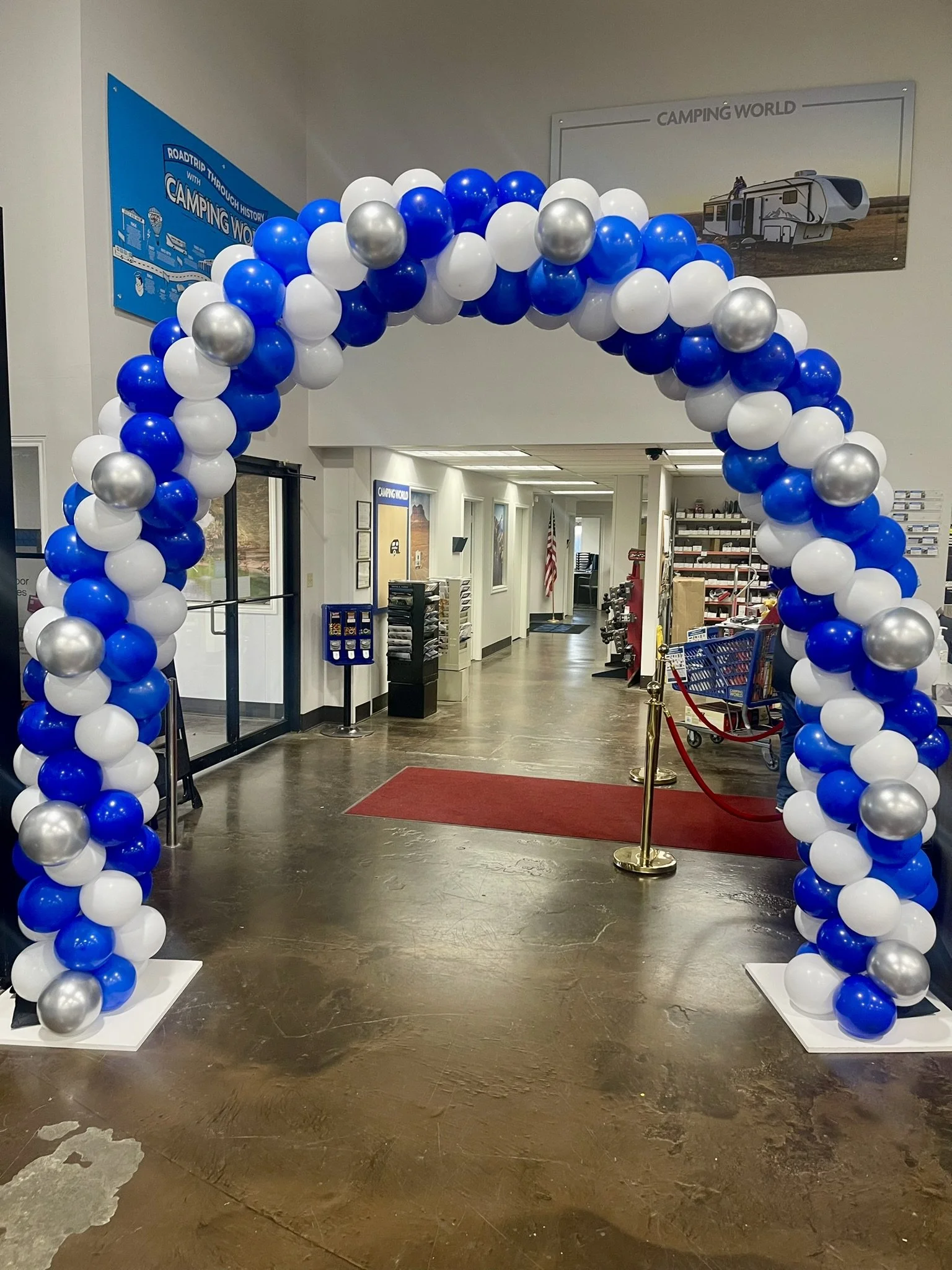 Balloon archway at Camping World entrance with blue, white, and silver balloons.