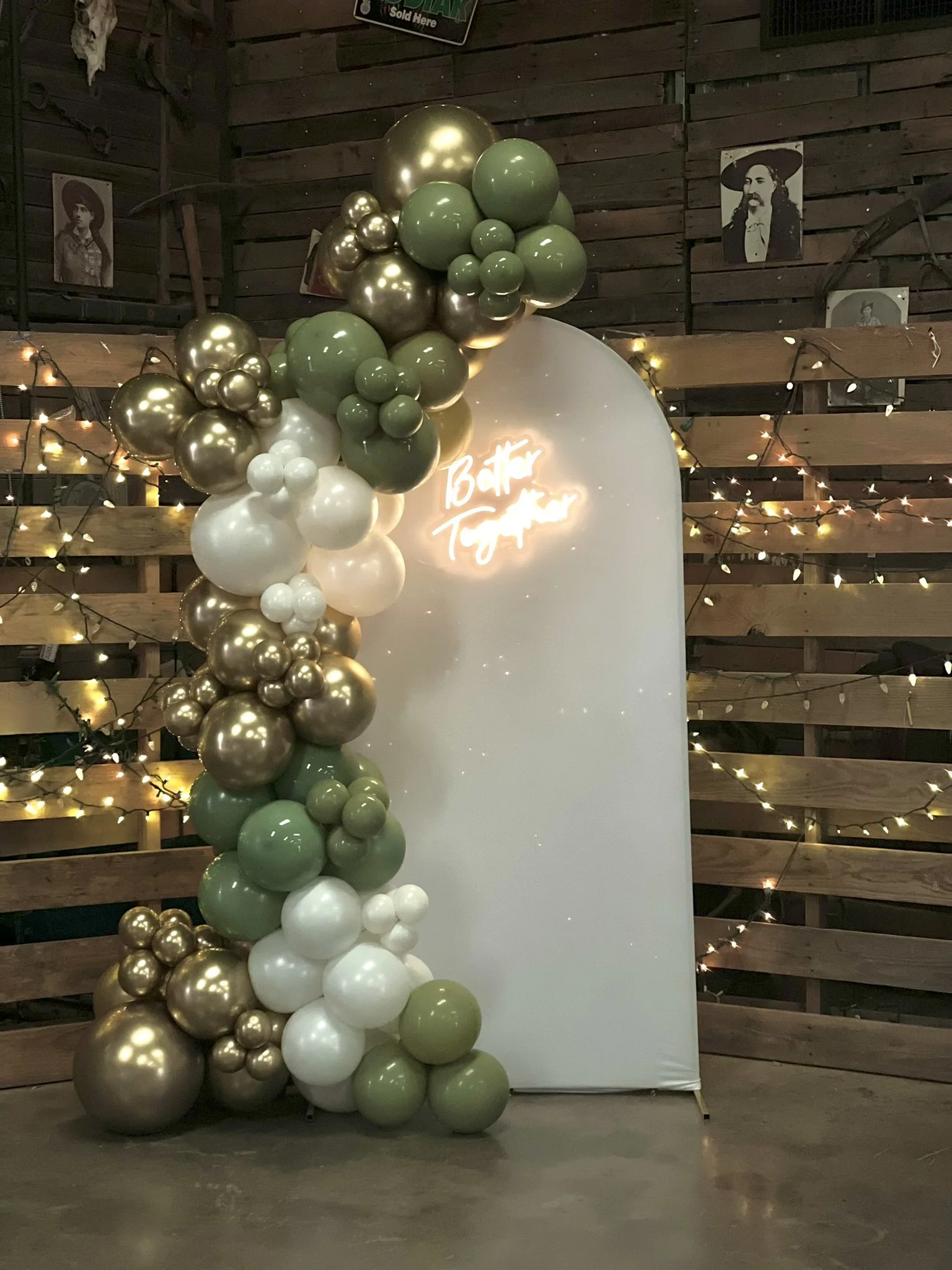 Decorative balloon arch with gold, green, and white balloons beside a sign that reads 'Better Together' in neon lights. Background features wooden paneling and string lights. View fullsize