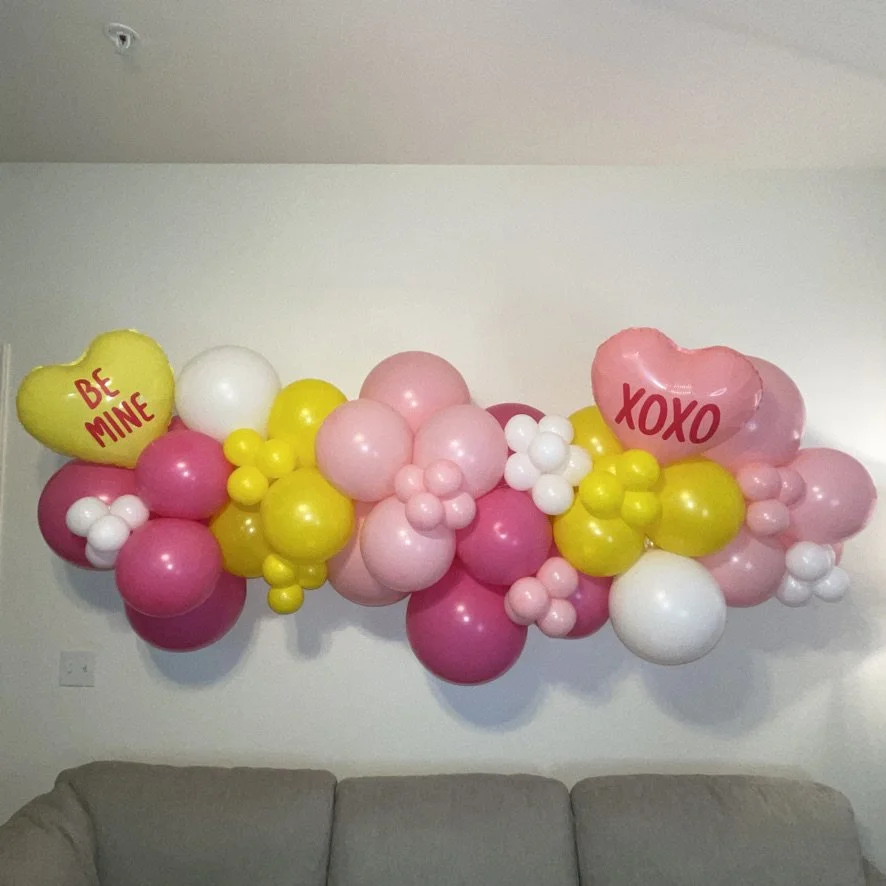Heart-shaped balloons with messages "BE MINE" and "XOXO" among pink, yellow, and white balloons arranged in a cluster on the wall above a sofa.