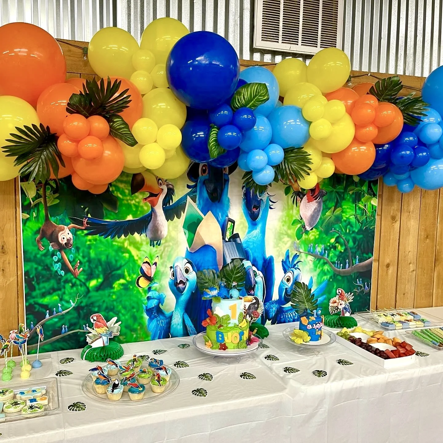 Colorful birthday party setup with balloons, jungle-themed backdrop featuring blue birds, cupcakes, a cake with the number one, tropical leaves, and fruit platters.