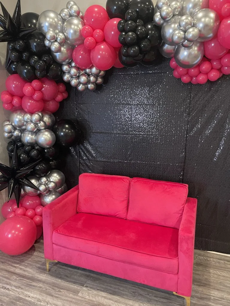 Pink sofa with black, pink, and silver balloons on a sparkling black backdrop.