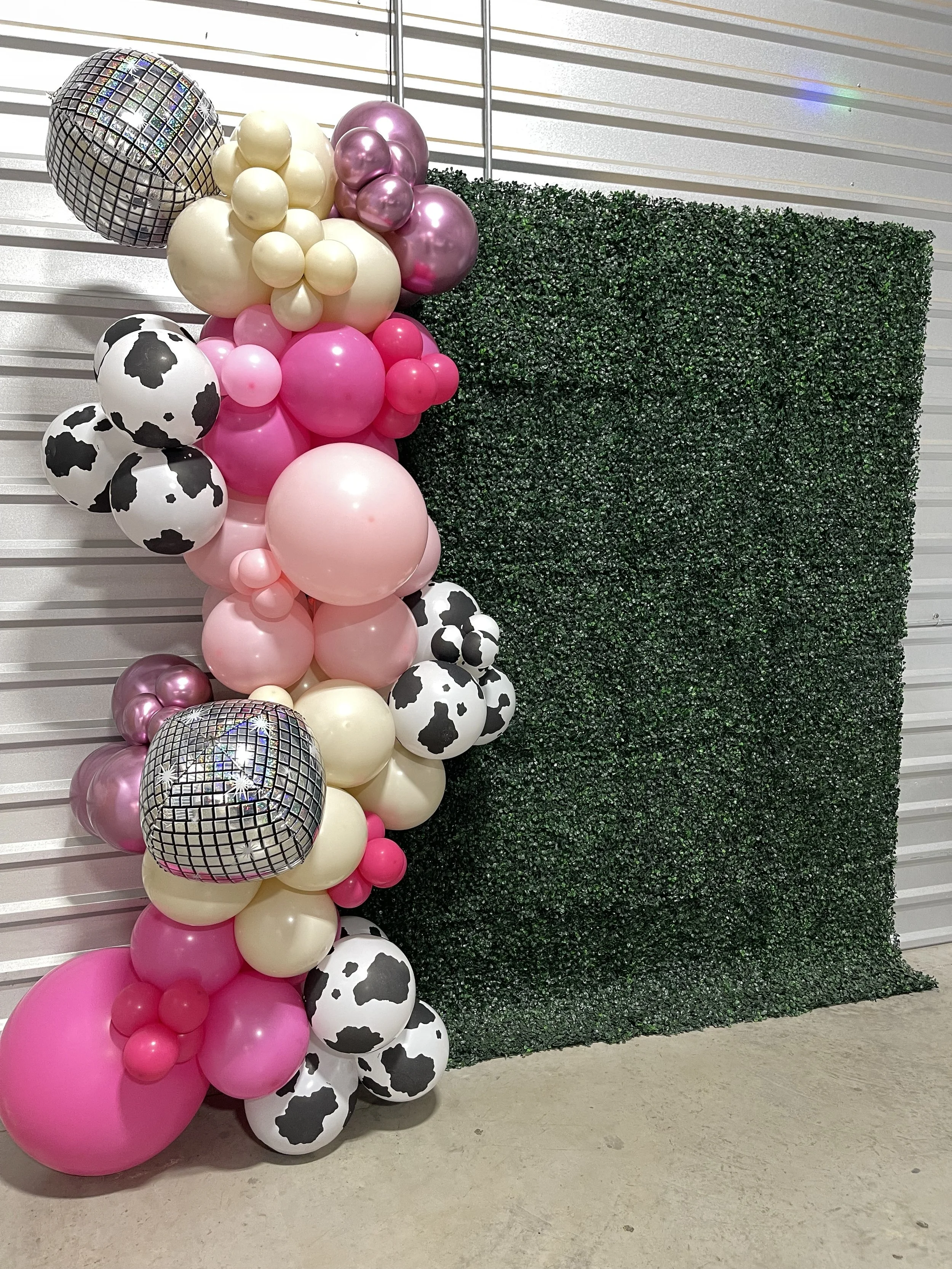 Birthday party setup with a pink backdrop and black bow, decorated with clusters of metallic silver and pink balloons.