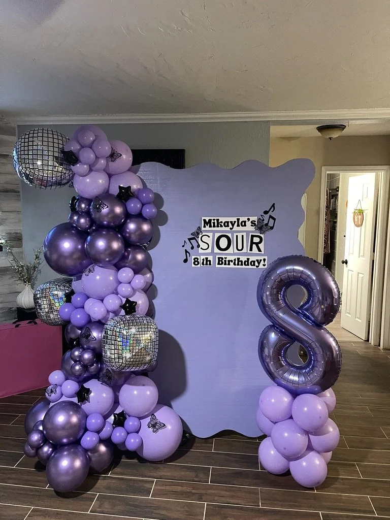 Purple-themed birthday decoration with a large "8" balloon, decorative balloons, and a sign reading "Sour 8th Birthday" in a room with wooden floors.