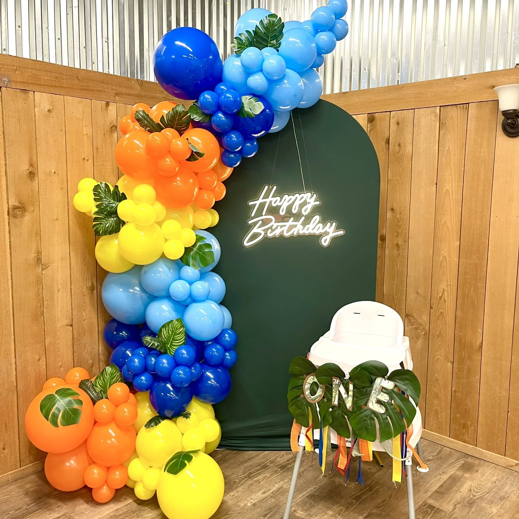 Birthday party setup with colorful balloon garland in orange, yellow, blue, and green, a dark green backdrop with neon "Happy Birthday" sign, and a decorated high chair with a banner reading "ONE."