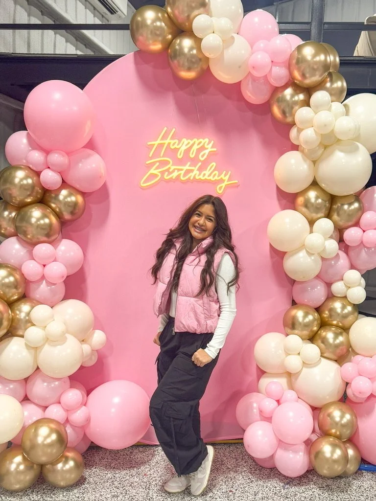 A person smiling in front of a pink 'Happy Birthday' backdrop decorated with pink, white, and gold balloons.