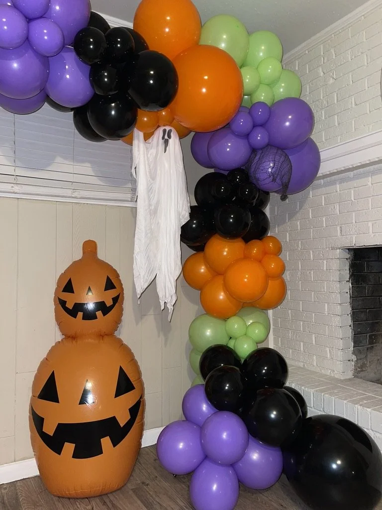 Halloween decoration with orange, black, purple, and green balloons, an inflatable pumpkin with a jack-o'-lantern face, and a small ghost hanging from the balloon arch next to a white brick fireplace.